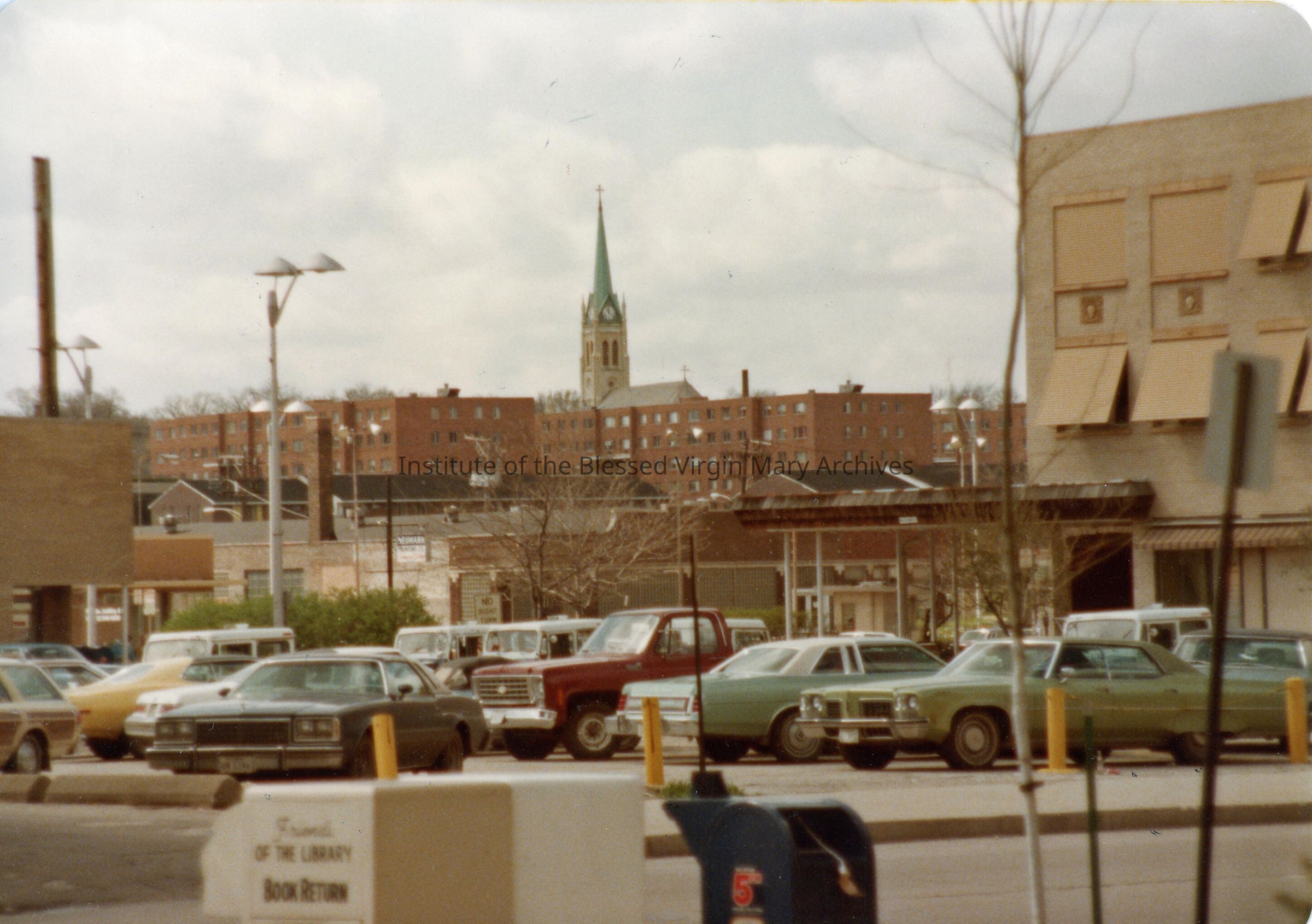 Looking northwest near the intersection of Cass Street and Ottawa Street in Joliet, Illinois. The parking lot in the foreground was previously the location of St. Mary's Academy. Completed in 1883, it was home to the IBVM and operated as a boarding school. The building was demolished in 1959 after its condition had deteriorated. St. John's Church is also visible in the distance.