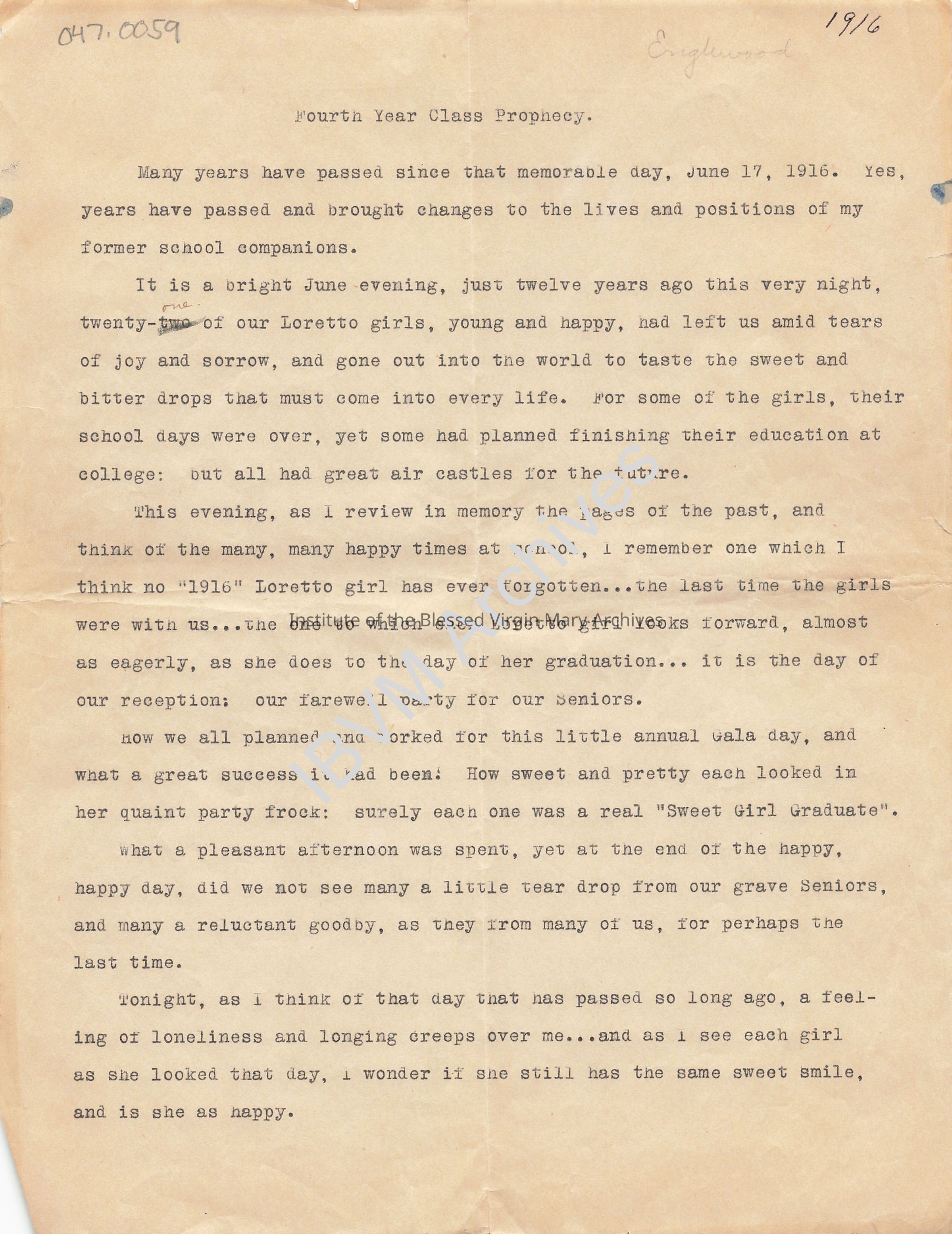 Fourth year class prophecy focusing on the Loretto Academy Englewood Class of 1916. It describes where students might be twelve years after graduation.