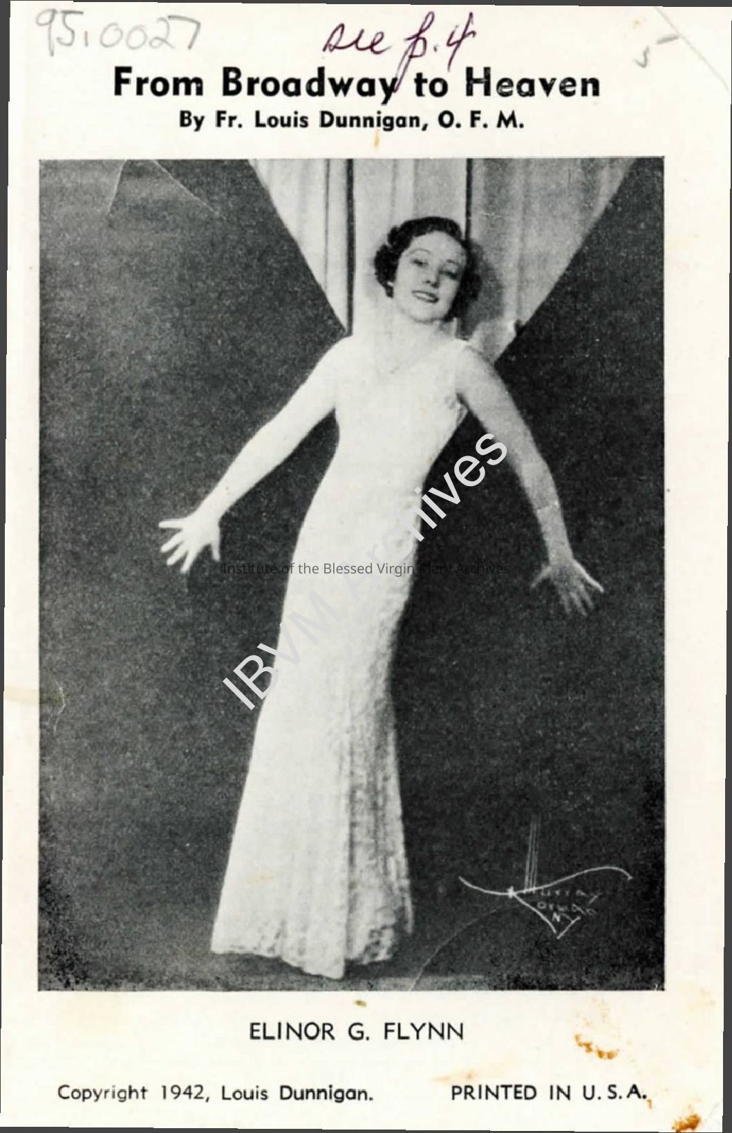 A biography of Elinor G. Flynn titled "From Broadway to Heaven". Written by Father Louis Dunnigan, the booklet describes Elinor's life from childhood to her death in 1938. While in Chicago, Elinor attended school at Holy Cross, St. Xavier's and Loretto Academy Woodlawn.