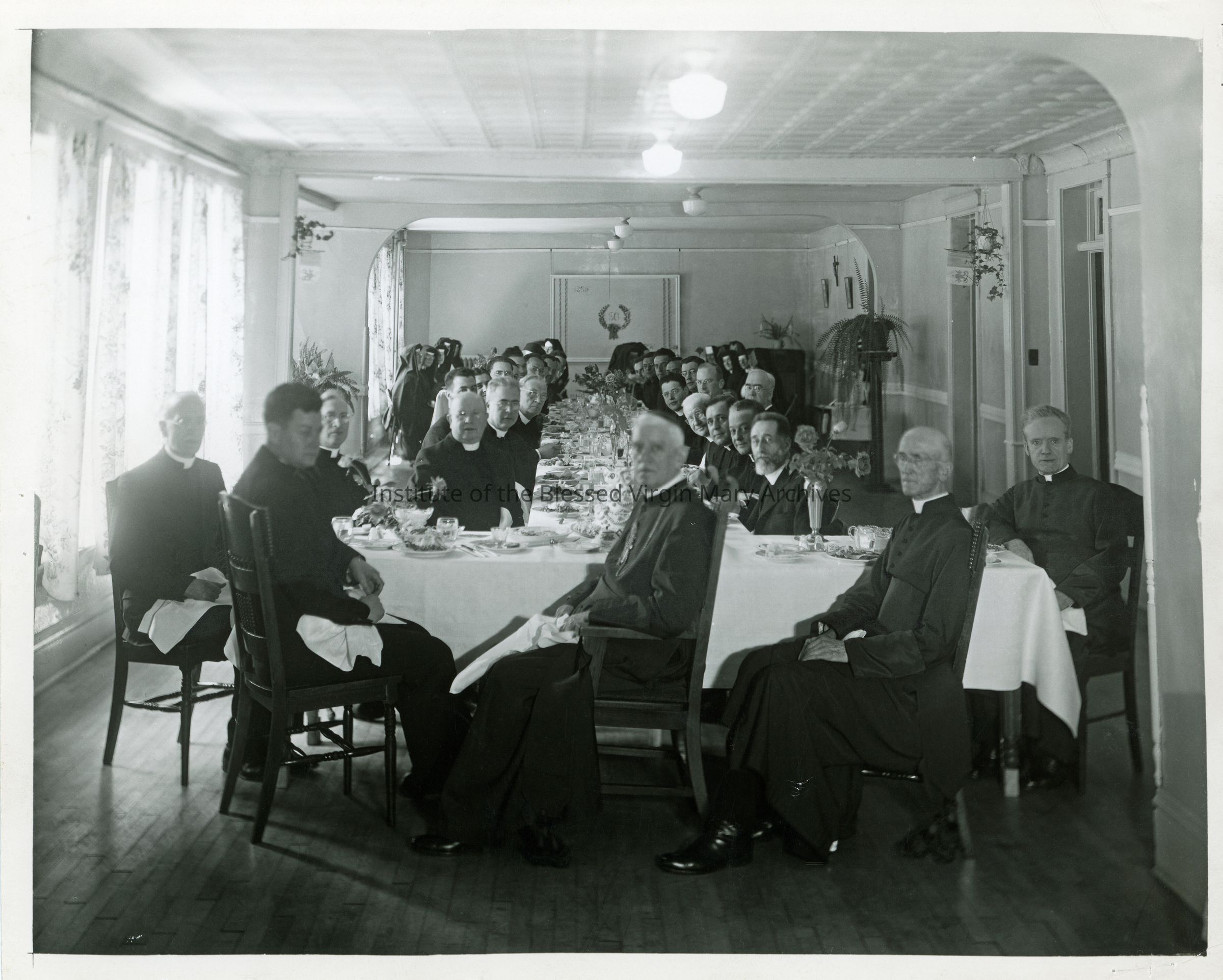 Golden Jubilee dinner celebrating the 50th anniversary of the IBVM in Sault Ste. Marie, Michigan. A number of priests and sisters are gathered in the convent located at 377 Armory Place, in Loretto Academy.
