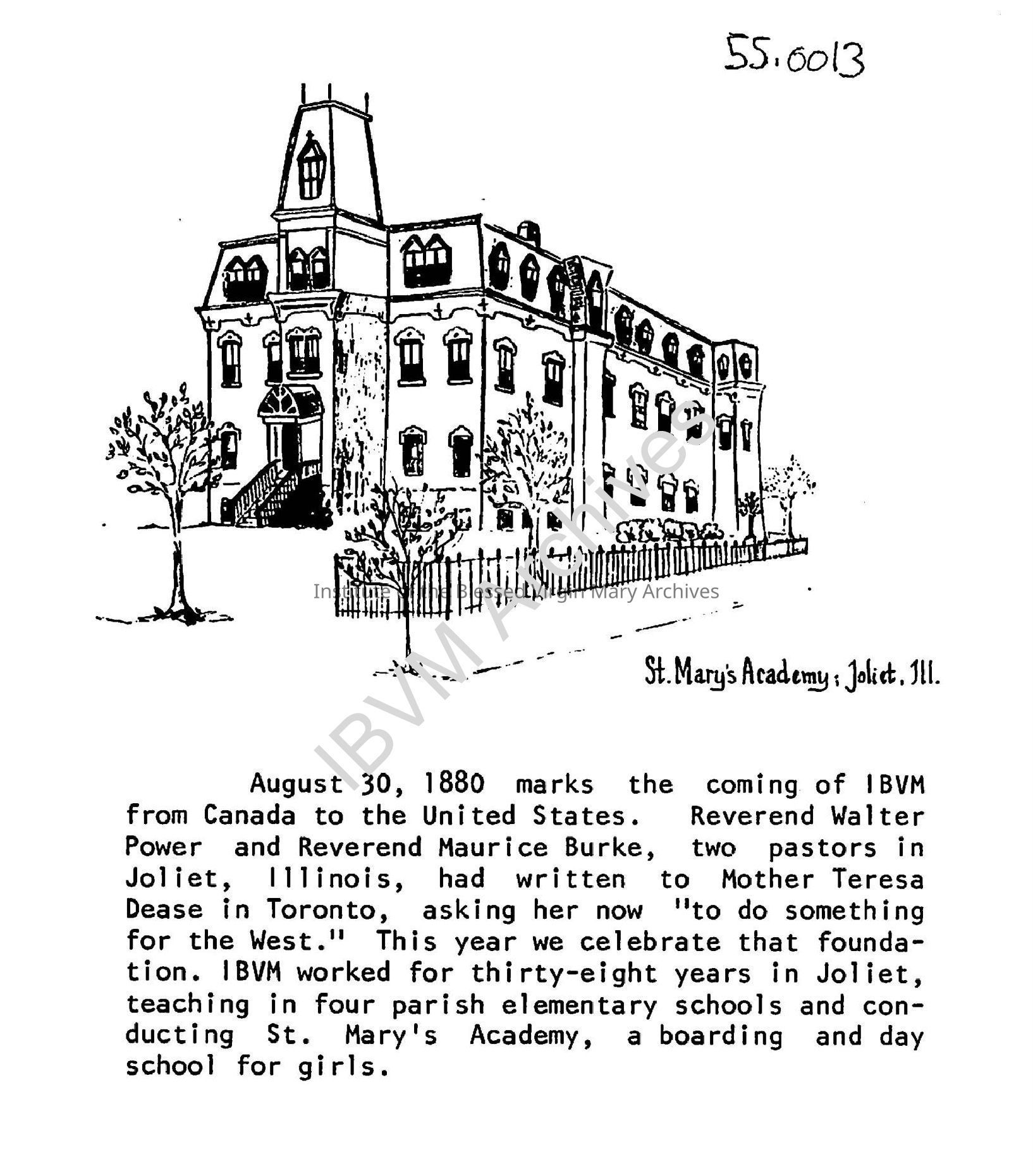 Brief history of St. Mary's Academy in Joliet, Illinois. The drawing was created by Sister Mary Carton in conjunction with the one hundredth anniversary of the IBVM in the United States. Completed in 1883, the academy was located on the southwest corner of Ottawa Street and Cass Avenue.