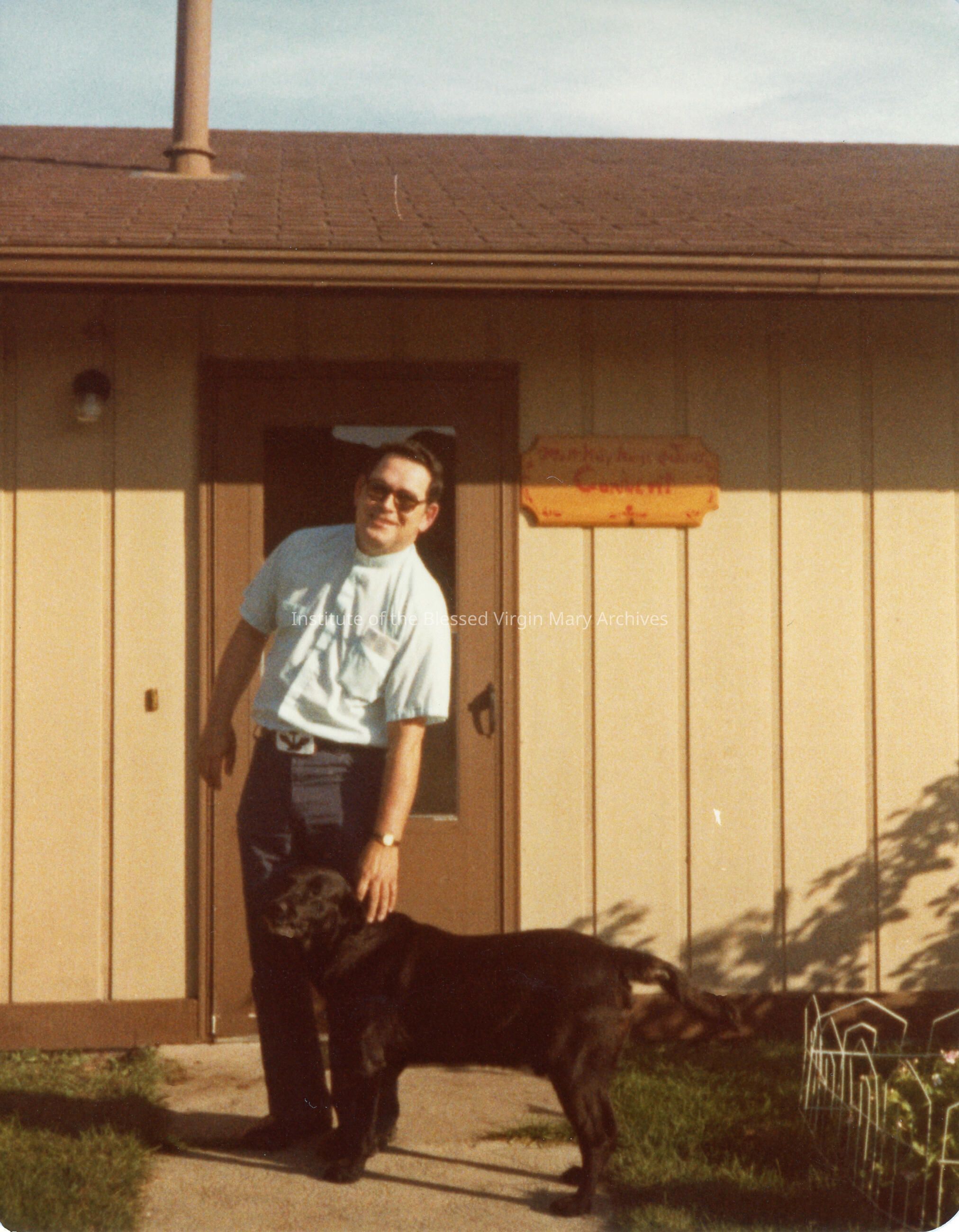 The Holy Name of Jesus Convent located near U.S. 41 and Tribal Center Road in Assinins, Michigan. A priest, believed to be Father John Hascall, poses with a dog. This property is part of the L'Anse Reservation.