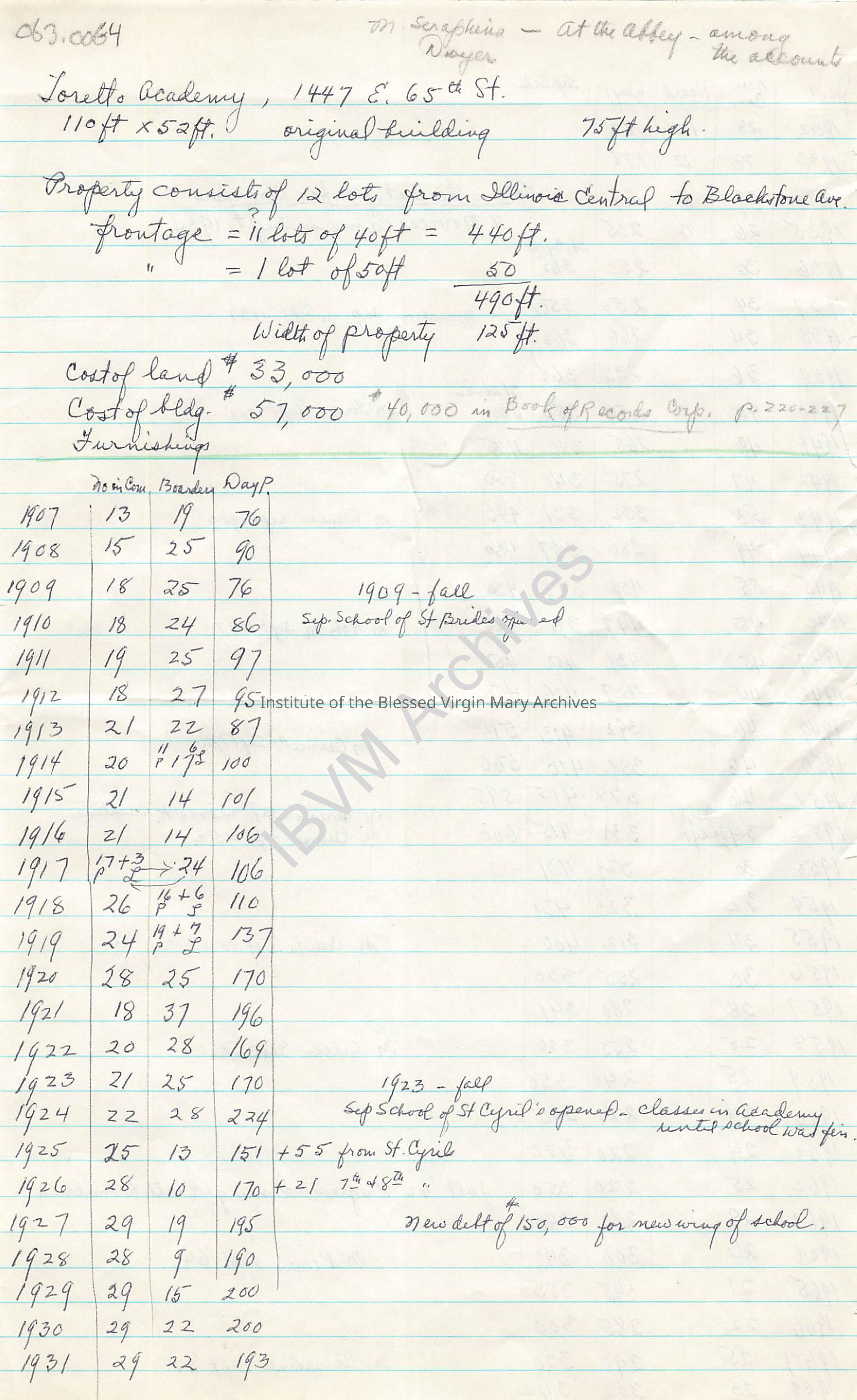 Notes and statistics detailing IBVM schools and communities from 1901 - 1972. Referenced locations include Woodlawn, West Chicago, Sault Ste. Marie, Loretto Academy, St. Bride's. St. Cyril's, St. Adrian's and St. Mary's Convent. Categories such as the number of Sisters in a community, boarders, day pupils and fees are also listed.Context