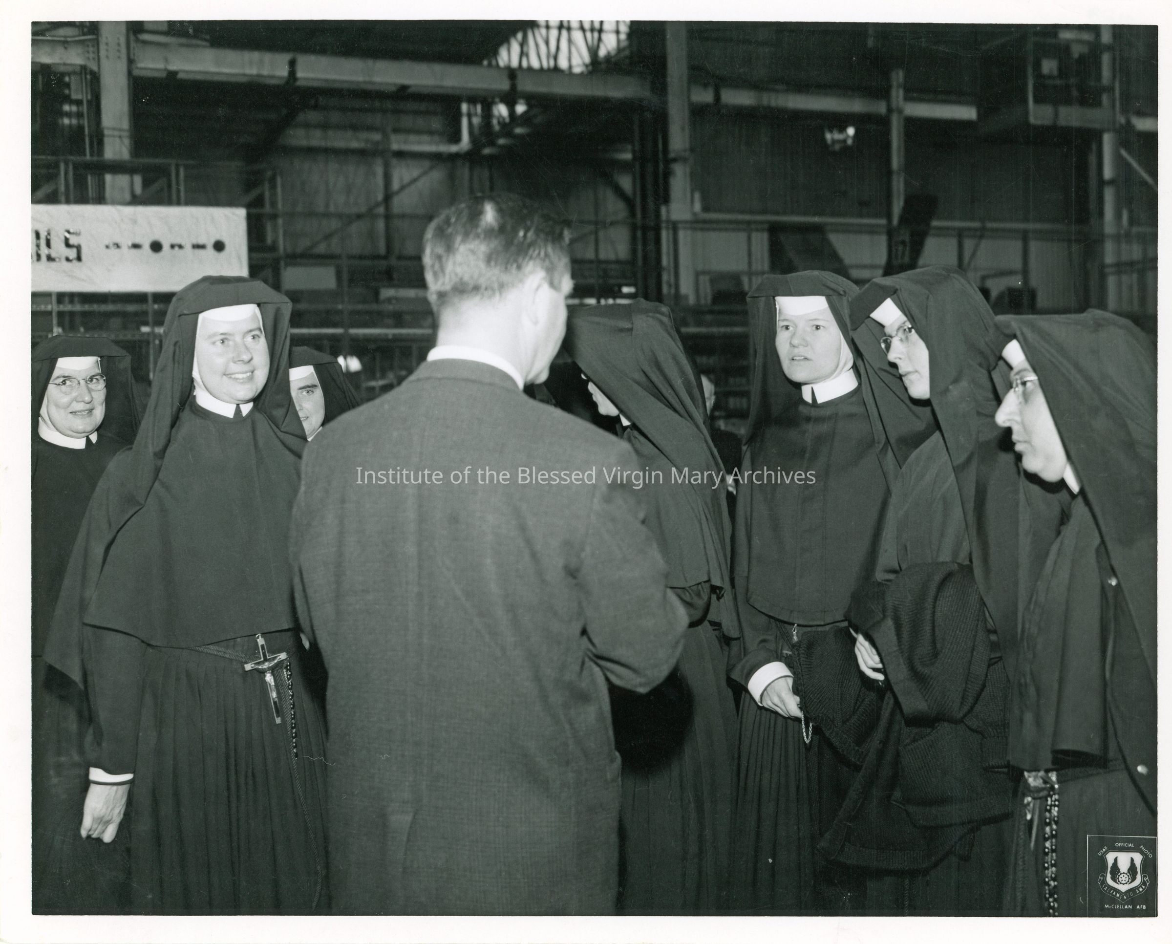 IBVM Sisters visiting McClellan Air Force Base located northeast of Sacramento, California. From left to right are Sister Patricia (Patrice) Mooney, Sister Betty (St. Brian) Rhoads, Sister Catherine (Perpetua) Hanlon, unidentified, unidentified, Sister Harriet (Lorraine) Crawford, Sister Nancy (Rosemarie) Doolin and Sister Lenore (Beata) Purpura. Opened in 1935, the base was closed in 2001.Context