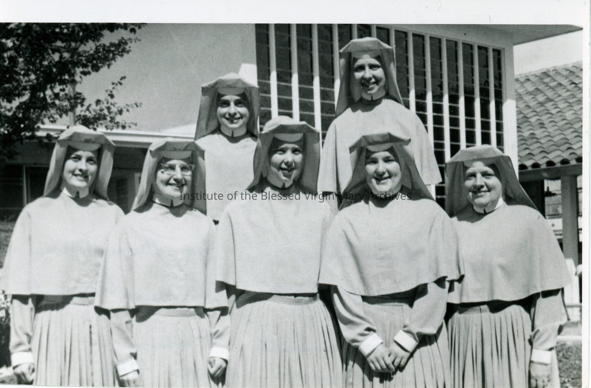 IBVM Sisters outside of St. Philomene's School located at 2320 El Camino Avenue in Sacramento, California. In the back row, from left to right, are Sister Mary Lou (St. Anthony) Poerio and Sister Catherine (Celine) Oliva. In the front row, from left to right, are Sister Marie (Claire Marie) Burns, Sister Sally (Celeste) Doolin, Sister Kathleen (Miriam) Scanlon, Sister Maureen (James Ellen) Ryan and Sister Deborah (St. Thomas More) Arment. These women were part of the Our Lady of the Assumption community in Carmichael, California.
