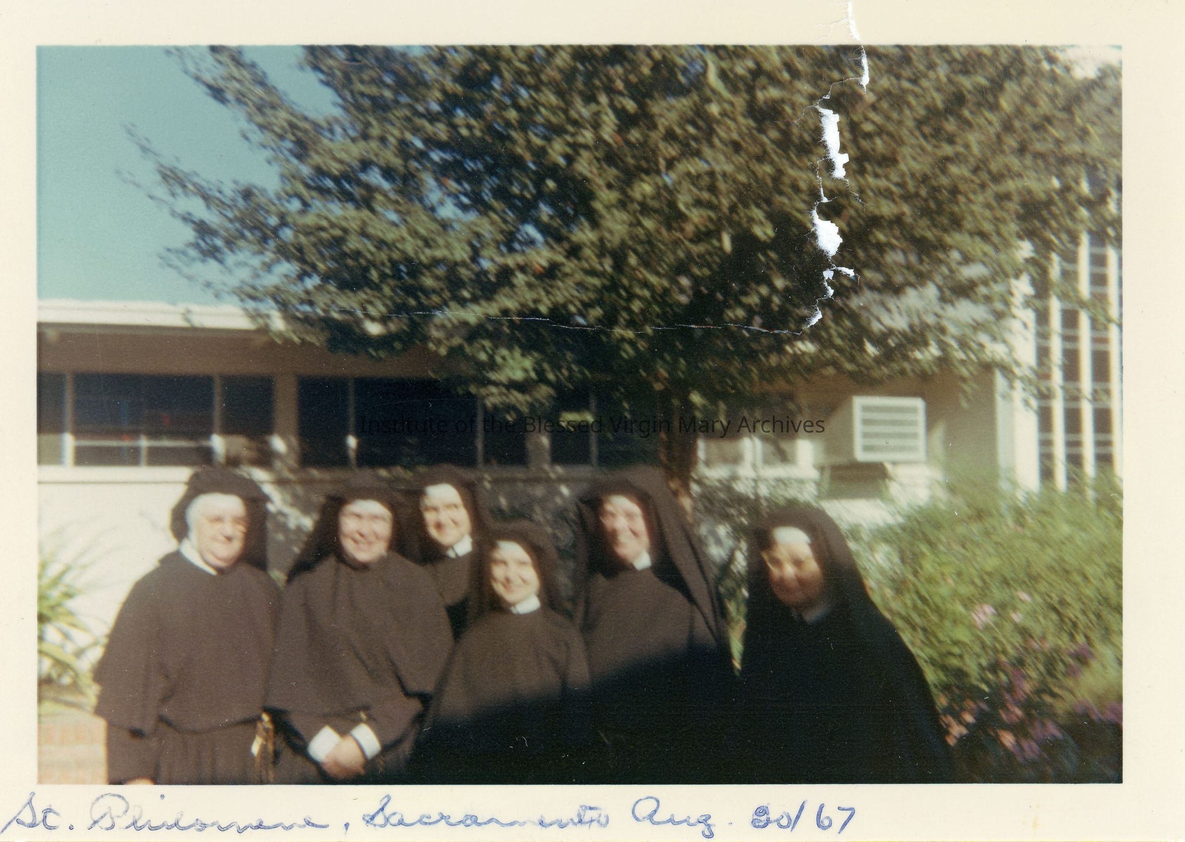 IBVM Sisters outside of St. Philomene's School located at 2320 El Camino Avenue in Sacramento, California. From left to right are Sister Grace (Thaddea) McIlvaney, Sister Catherine (Mary Juana) Gallagher, Sister Dorothy (Wilhelmine) Fromm, Sister Francis de Sales, Sister Mildred (St. Mel) McNally and Sister Mary (Laurentia) Loveland.