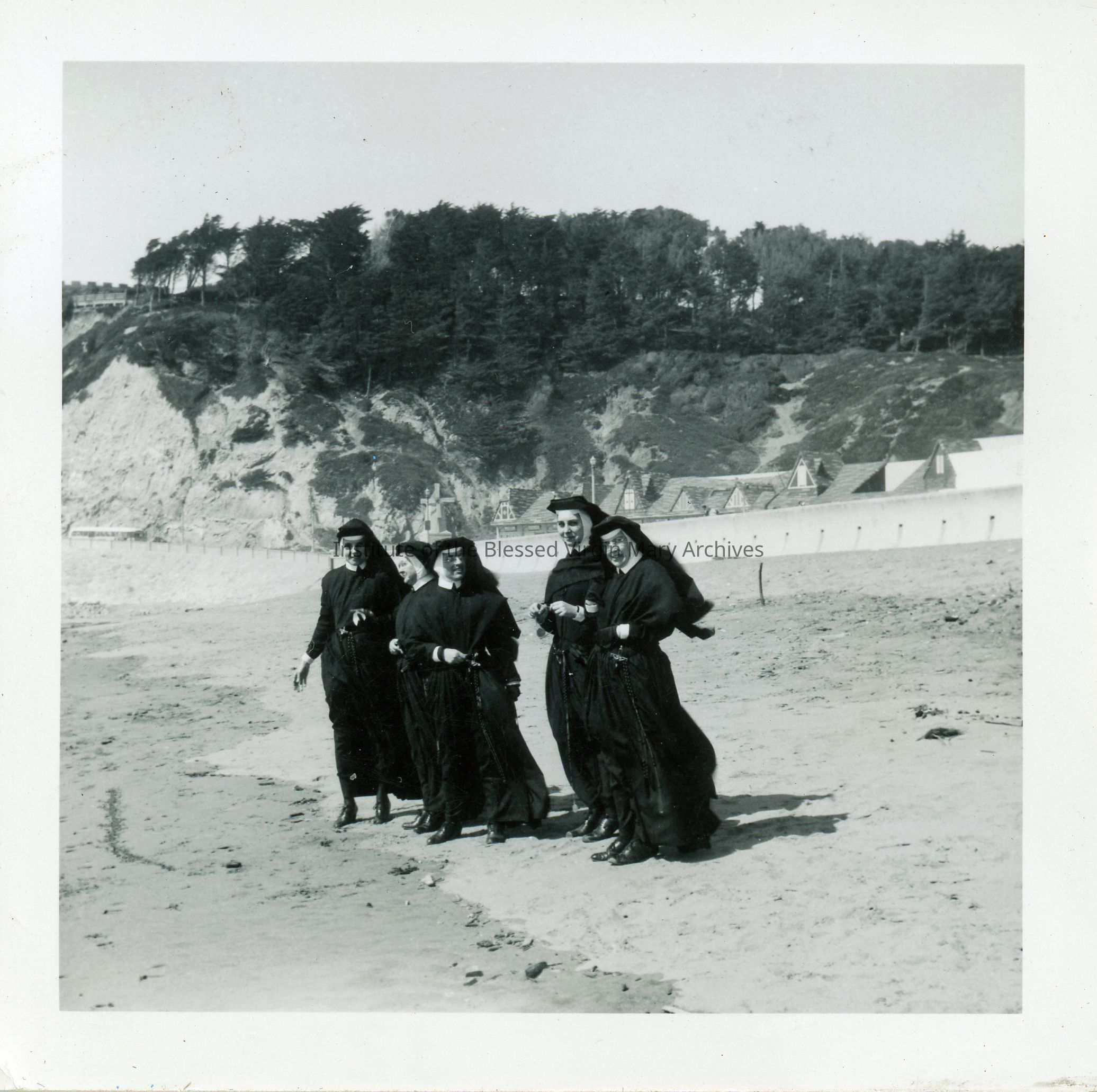 IBVM Sisters on a beach in California. From left to right are Sister Catherine (Mary Andre) Hensel, Sister Mary (Laurentia) Loveland, Sister Agnes (Catalda) Labelle, Sister Irene (Mary Emmanuel) Hayes and Sister Marita (St. Frederick) Kompare. The women were from the community at St. Philomene's in Sacramento.