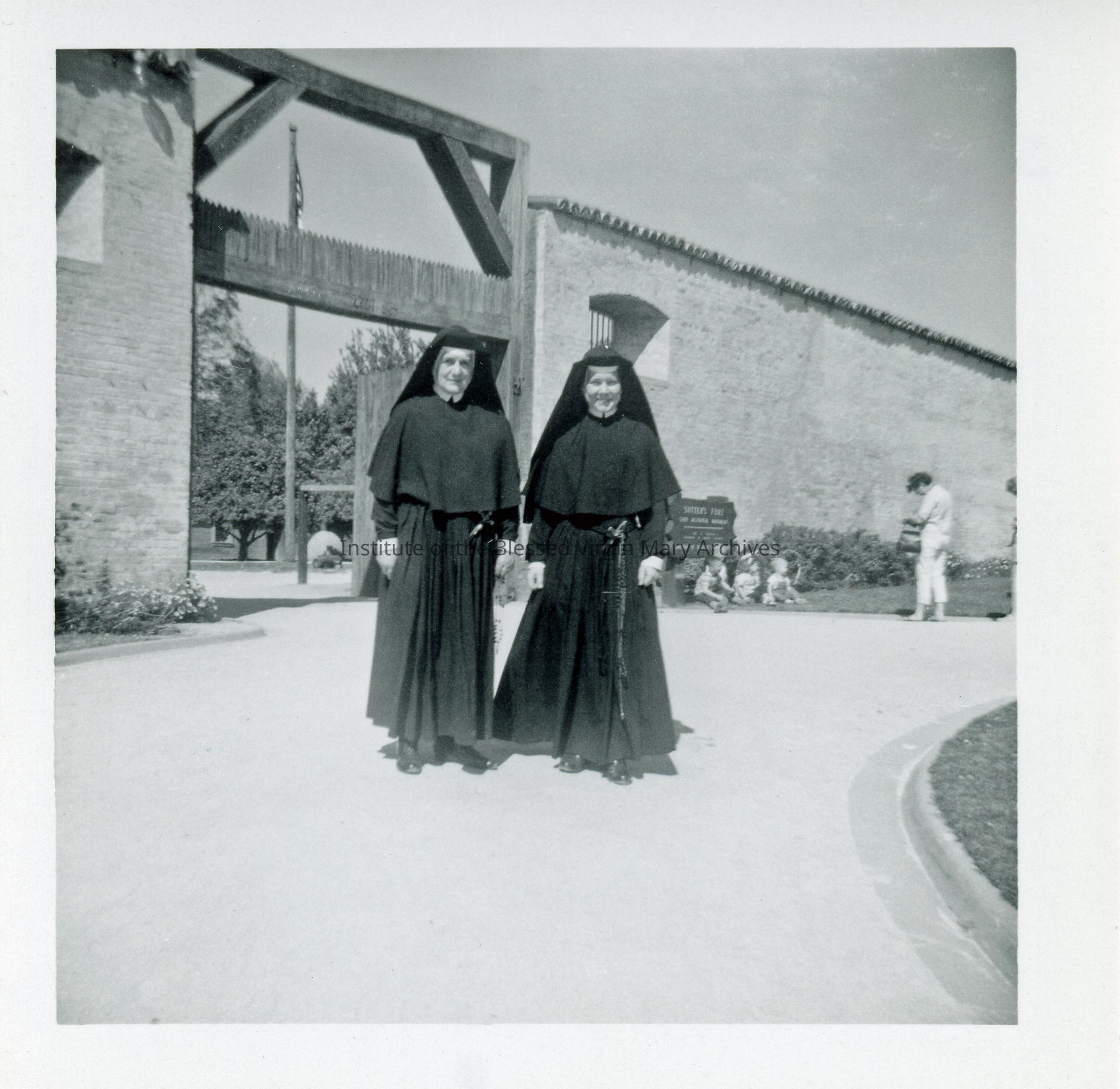 IBVM Sisters visiting Sutters Fort in Sacramento, California. From left to right are Sister Veronica (Lucia) Altenberg and Sister Miriam (Mary Clare) Mracek. The women were from the community at St. Philomene's in Sacramento.