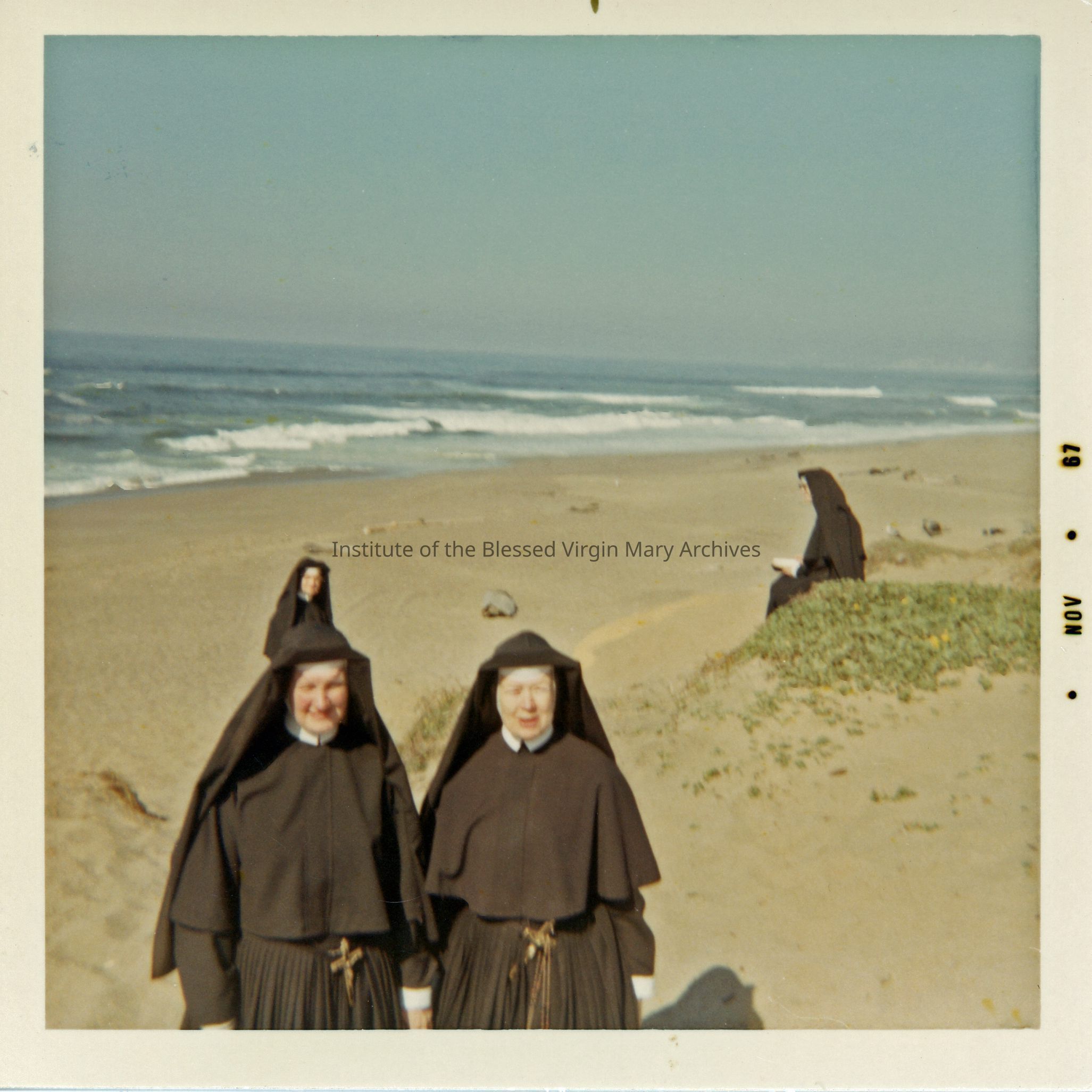 IBVM Sisters on a beach in California. In the foreground, from left to right, are Sister Patricia (Anastasia) O'Connor and Sister Marjorie (Edwarda) Allen. The women were from the community at St. Philomene's in Sacramento.