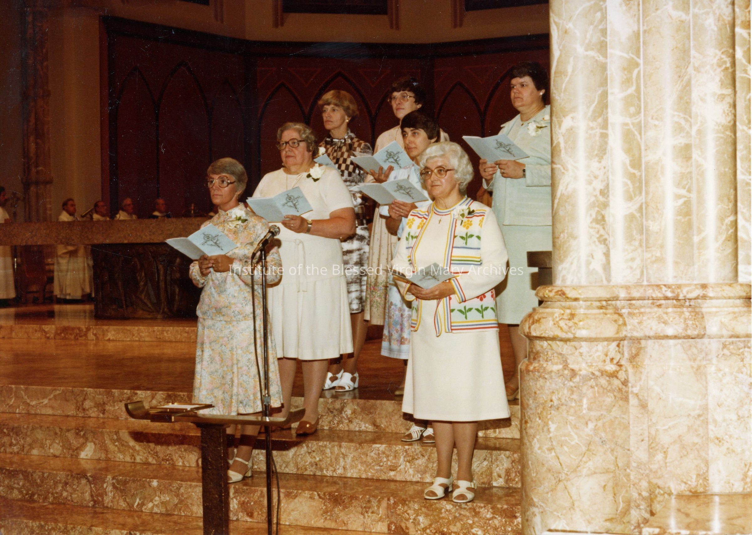 IBVM Sisters singing in Sacramento, California. In the first row, from left to right, are Sister Dolores Ann (Evelyn) McCloskey and Sister Nora (St. Catharine) Lowe. In the second row, from left to right, are Sister Deborah (St. Thomas More) Arment and Sister Mary (St. Angela) Iwanski. In the back row, from left to right, are Sister Barbara Lasinski, Sister Arlene (Alma) Connelly and Sister Jean Frye.Context