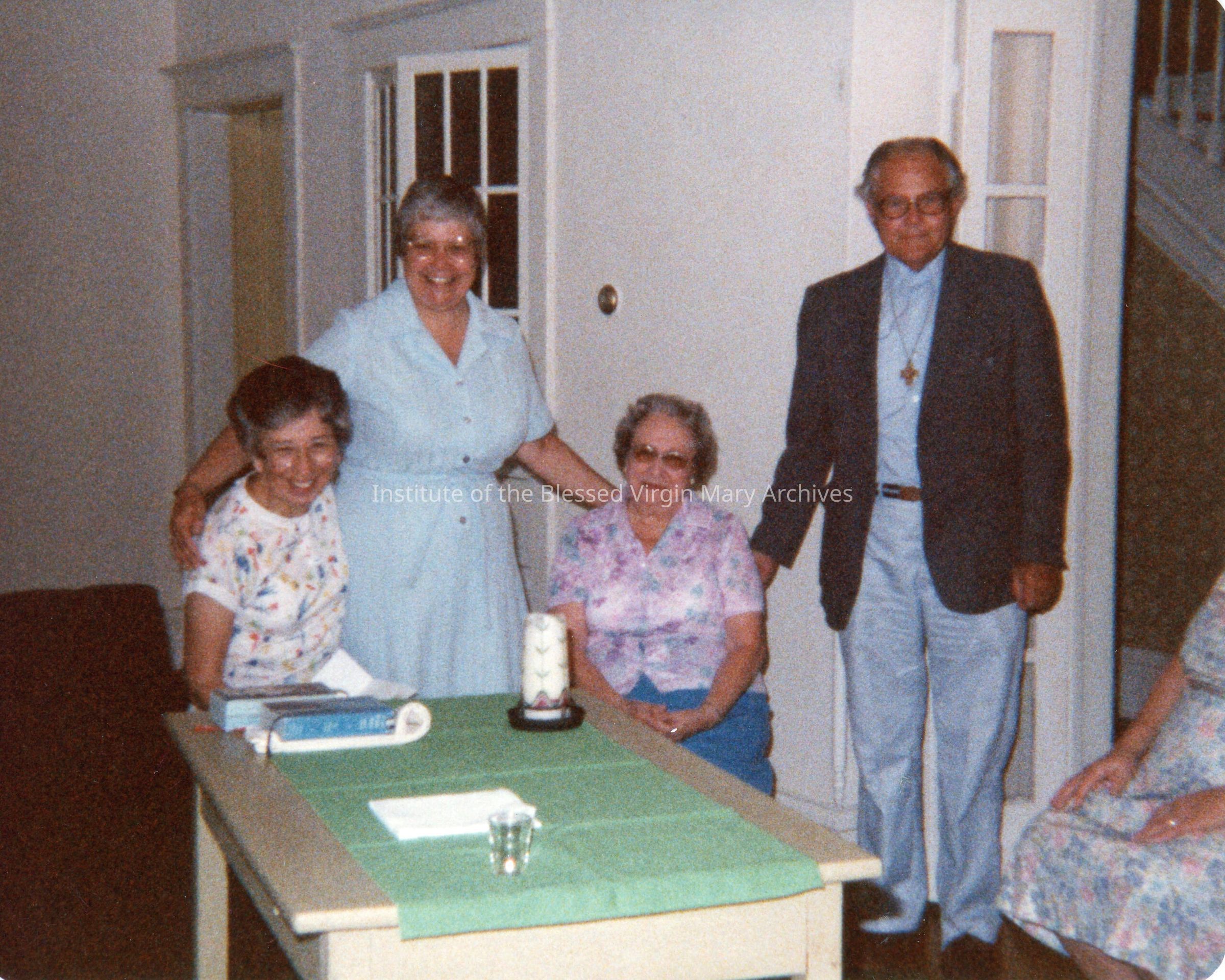 IBVM Sisters at 414 Dawson Street in Sault Ste. Marie, Michigan. From left to right are Sister Merel (Frances Cabrini) DeMott, Sister Mary Ann (Mark) White, Mrs. White, Father Lawless and Sister Mary (Corona) Quinn. This event is described as the "last Mass in the house on Dawson". The Sisters moved to this home after the IBVM Convent, located at 377 Maple Street, closed in late 1984.