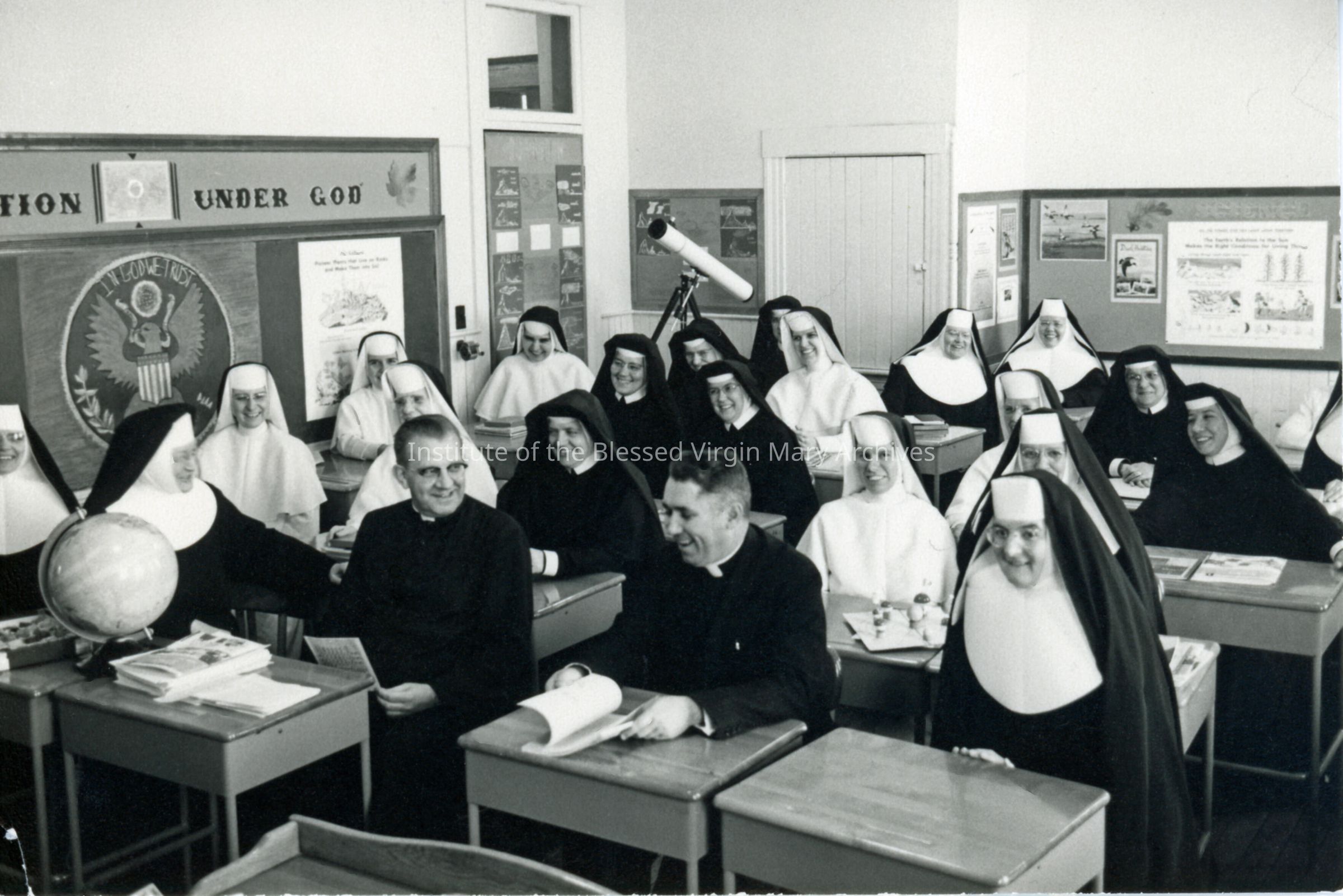 Sisters and priests gathered in Sault Ste. Marie, Michigan. IBVM Sisters present include Sister Deborah (St. Thomas More) Arment, Sister Suzanna (Magdalena) Savoie, Sister Helen (St. Norbert) LaLonde, Sister Gertrude (St. Edmund) McGuire, Sister Catherine (St. Felix) Heraty, Sister Ruby (Eleanor) Adatte and Sister Merel (Frances Cabrini) DeMott.