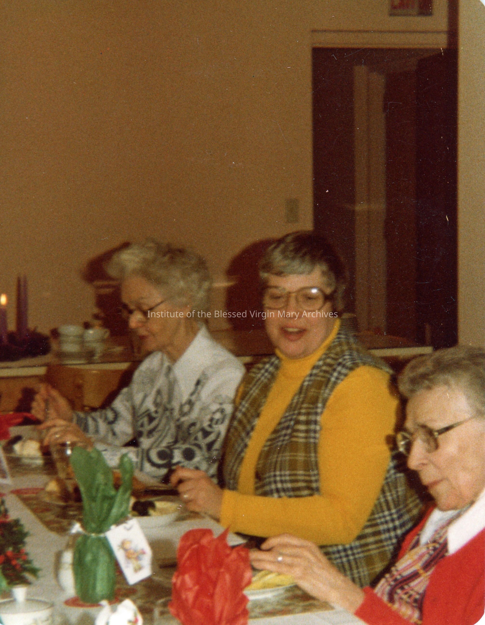 Loretto Sisters celebrating Christmas in Sault Ste. Marie, Michigan. From left to right are Sister Marion (Philomena) Murphy, Sister Mary Ann (Mark) White and Sister Mary (St. Aedan) Porter.