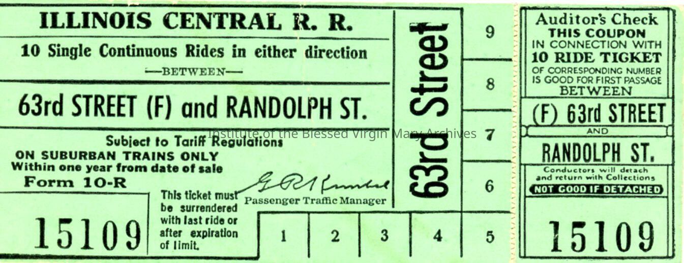 Illinois Central R.R. Ticket for use between 63rd Street and Randolph Street in Chicago. Students attending Loretto Academy Woodlawn used this route while attending classes. The station, at 63rd Street and Dorchester Avenue, was situated just north of the school.