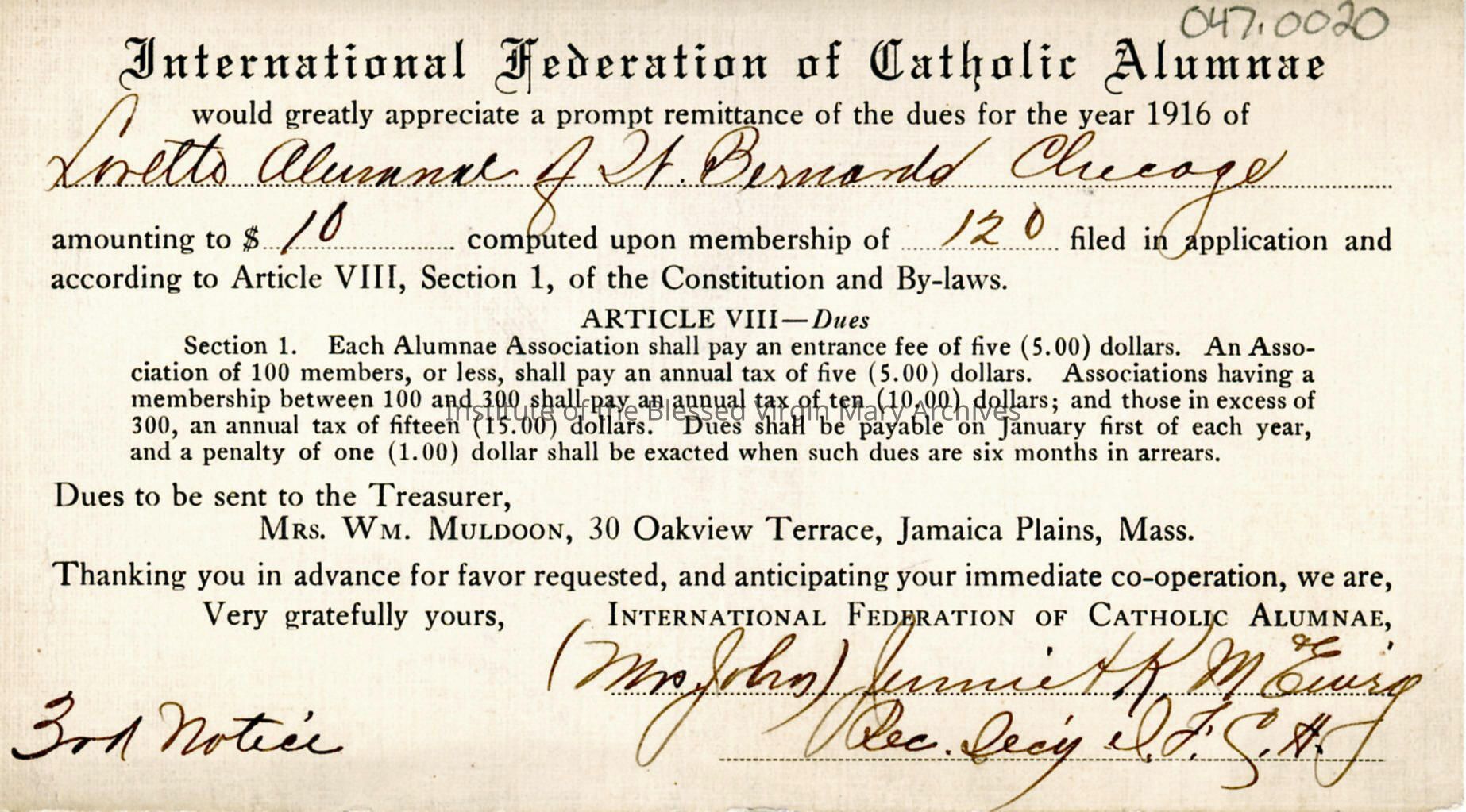 Remittance card for the International Federation of Catholic Alumnae. It was issued to the Loretto Alumnae of St. Bernard in 1916.