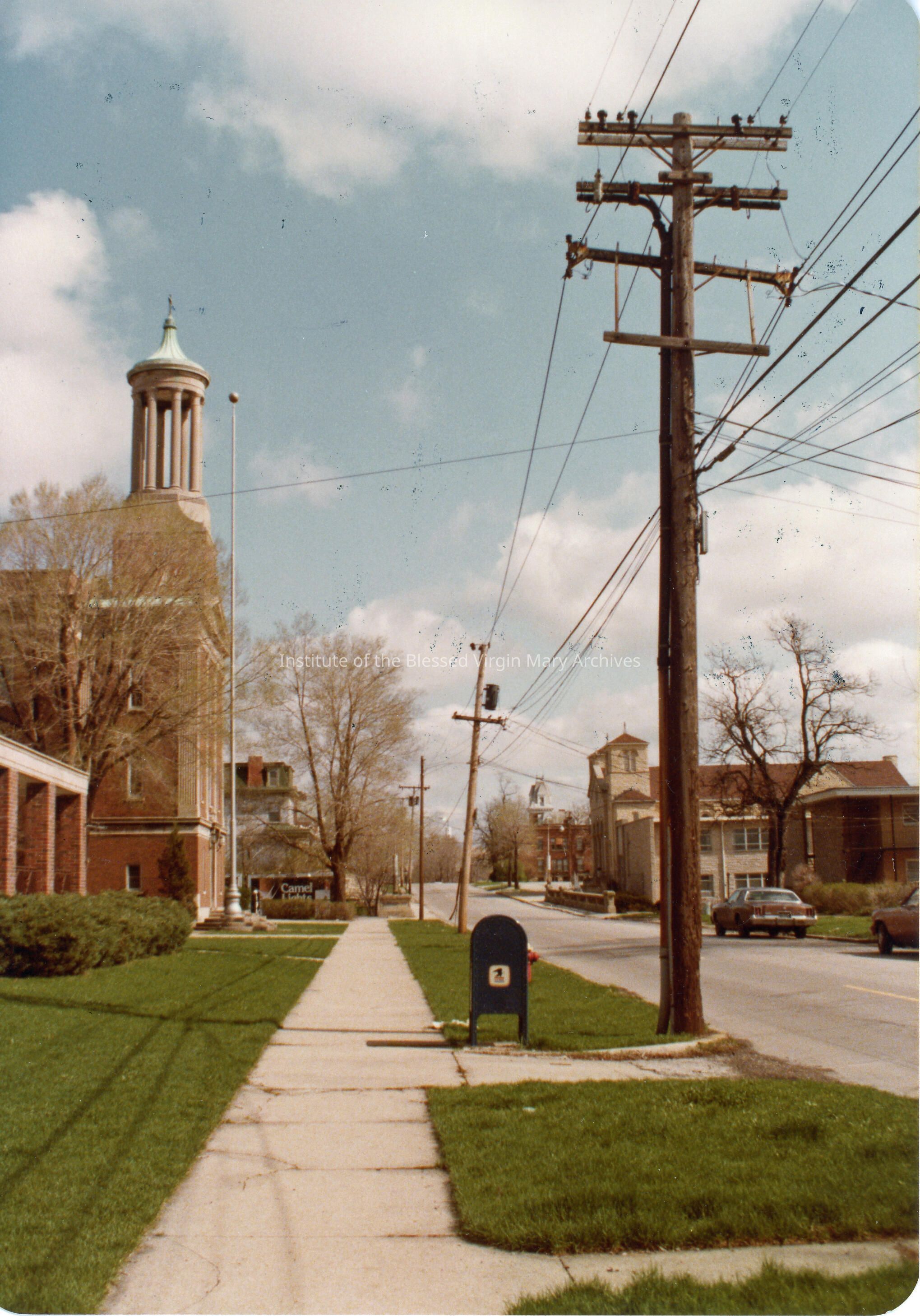 Broadway Street, looking north toward Jefferson Street, in Joliet, Illinois. At this time, the building on the left was home to Joliet Catholic High School at 29 North Broadway Street. Opened in 1918 as De La Salle High School, it was renamed Joliet Catholic in 1933 and remained at this location until 1990. Formerly, this site was home to the first St. Patrick's Church which opened in 1839. After their arrival in Joliet, the IBVM Sisters stayed at St. Patrick's for a brief period. They also taught at the parish school until 1914. Further down on the right is the All Saints Greek Orthodox Church.