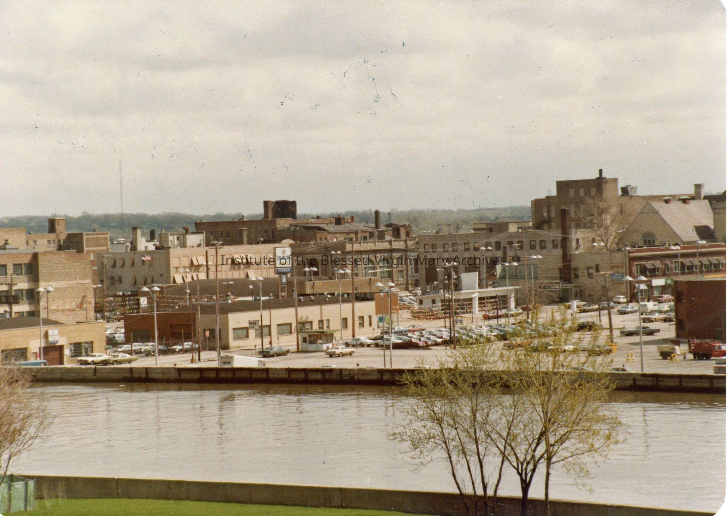 Looking east across the Des Plaines River in Joliet, Illinois. It was taken near Joliet Catholic High School located at 29 North Broadway Street. Near the center of this image is the former site of St. Mary's Academy. Completed in 1883, it was home to the IBVM and operated as a boarding school. The building was demolished in 1959 after its condition had deteriorated. In the distance, the Joliet Public Library is just visible on the right.