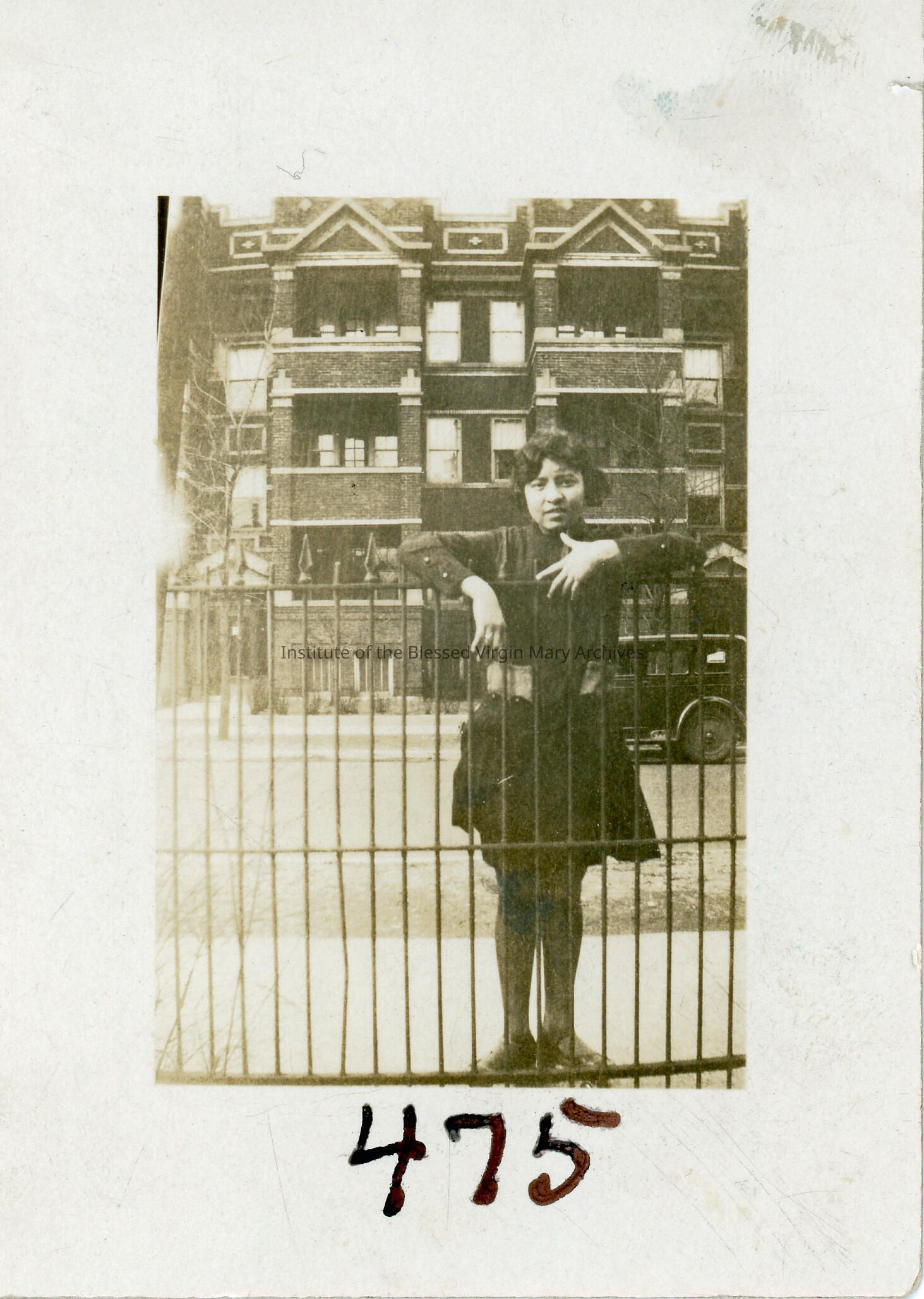 Josephine Lopez in front of Loretto Academy Woodlawn. Buildings along 65th Street are visible in the background.
