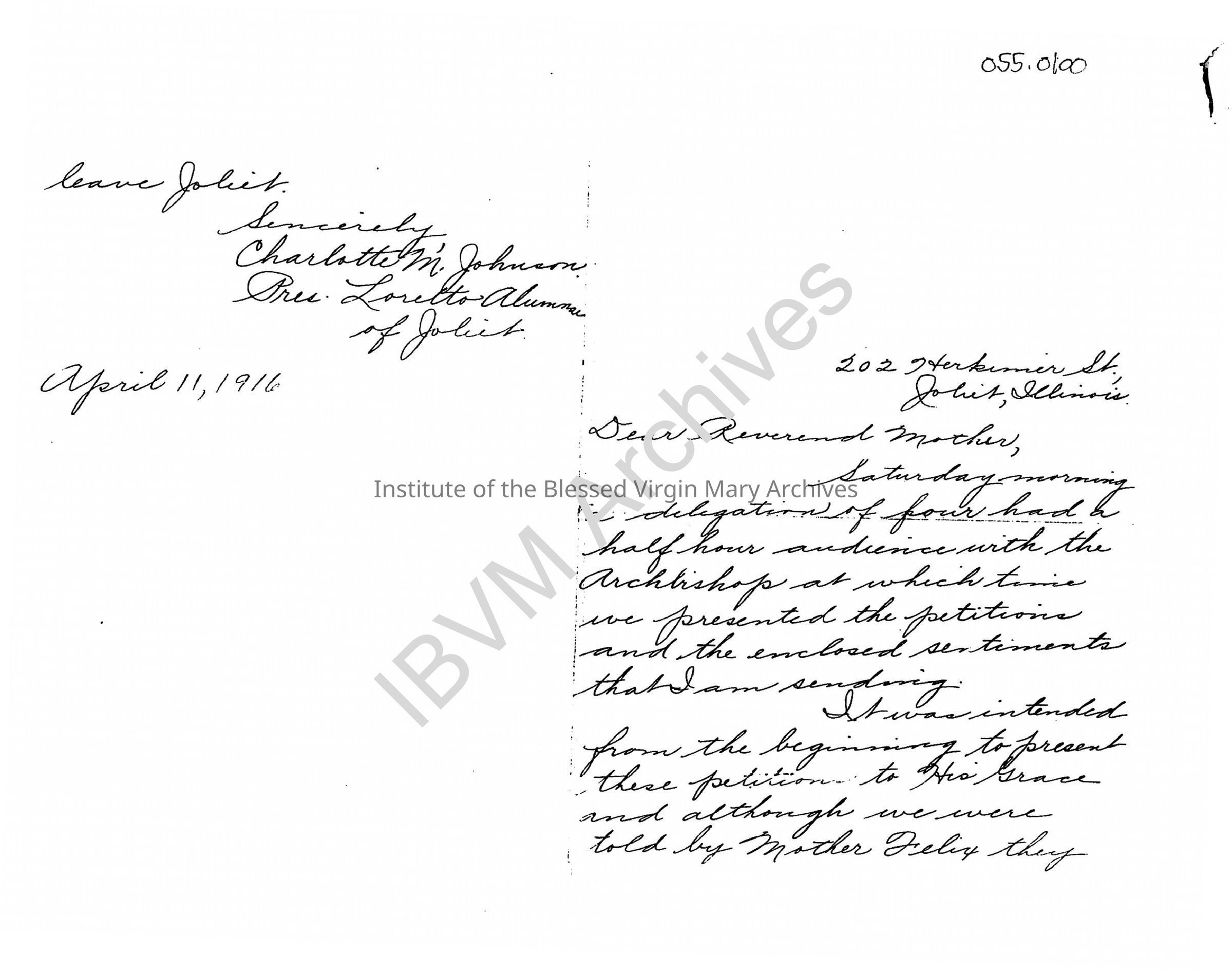 Handwritten letter from Charlotte M. Johnson, President of the Loretto Alumnae of Joliet. It details a meeting between the Archbishop of Chicago and a delegation of Loretto Alumnae. During the meeting the delegation presented a petition and expressed their desire that the Sisters stay in Joliet. A copy of the petition itself is also included.