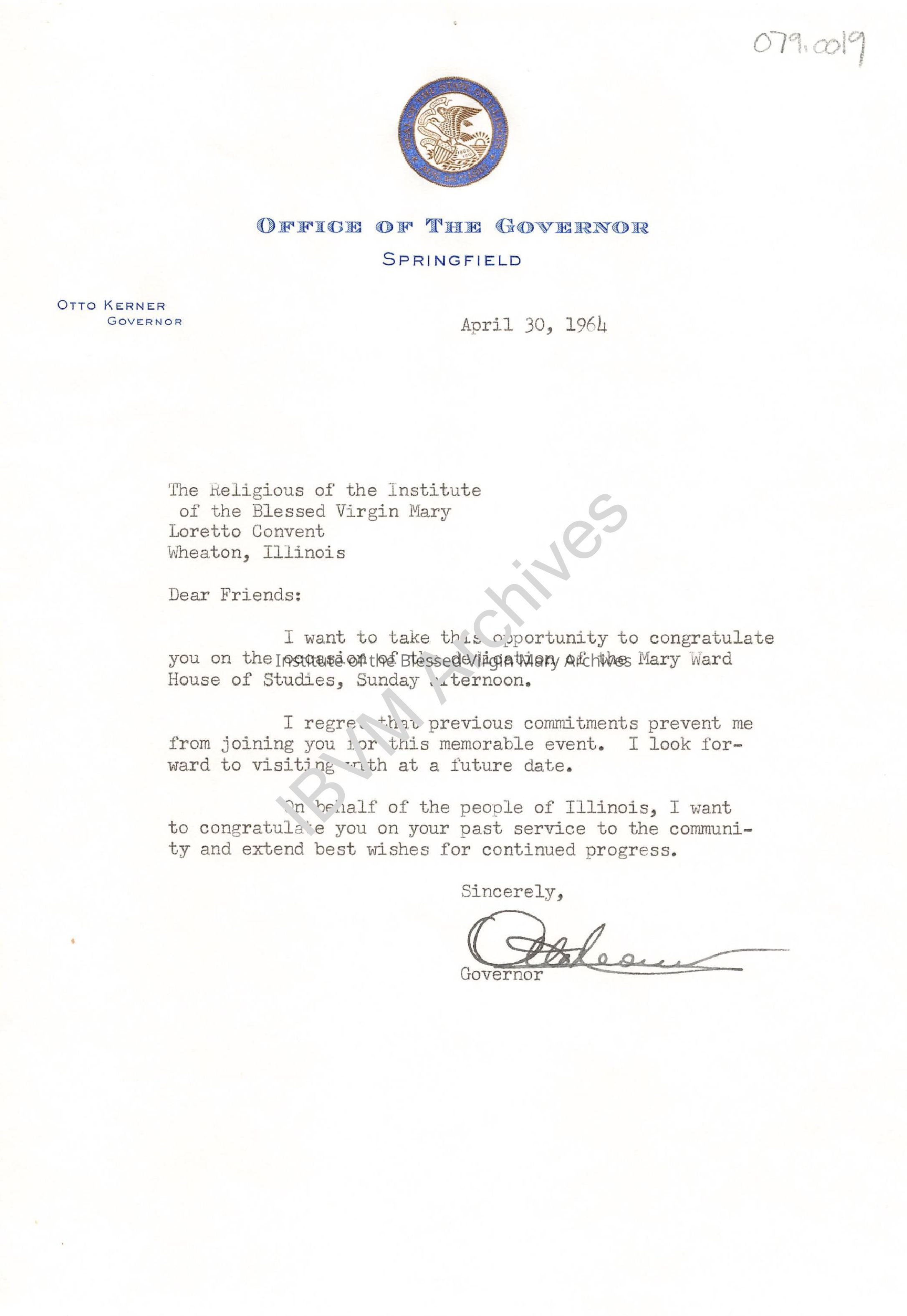 Letter from Illinois Governor Otto Kerner. It discusses the upcoming dedication ceremony for the Mary Ward House of Studies. Completed in 1964, the building was located adjacent to the Loretto Convent and Chapel in Wheaton.