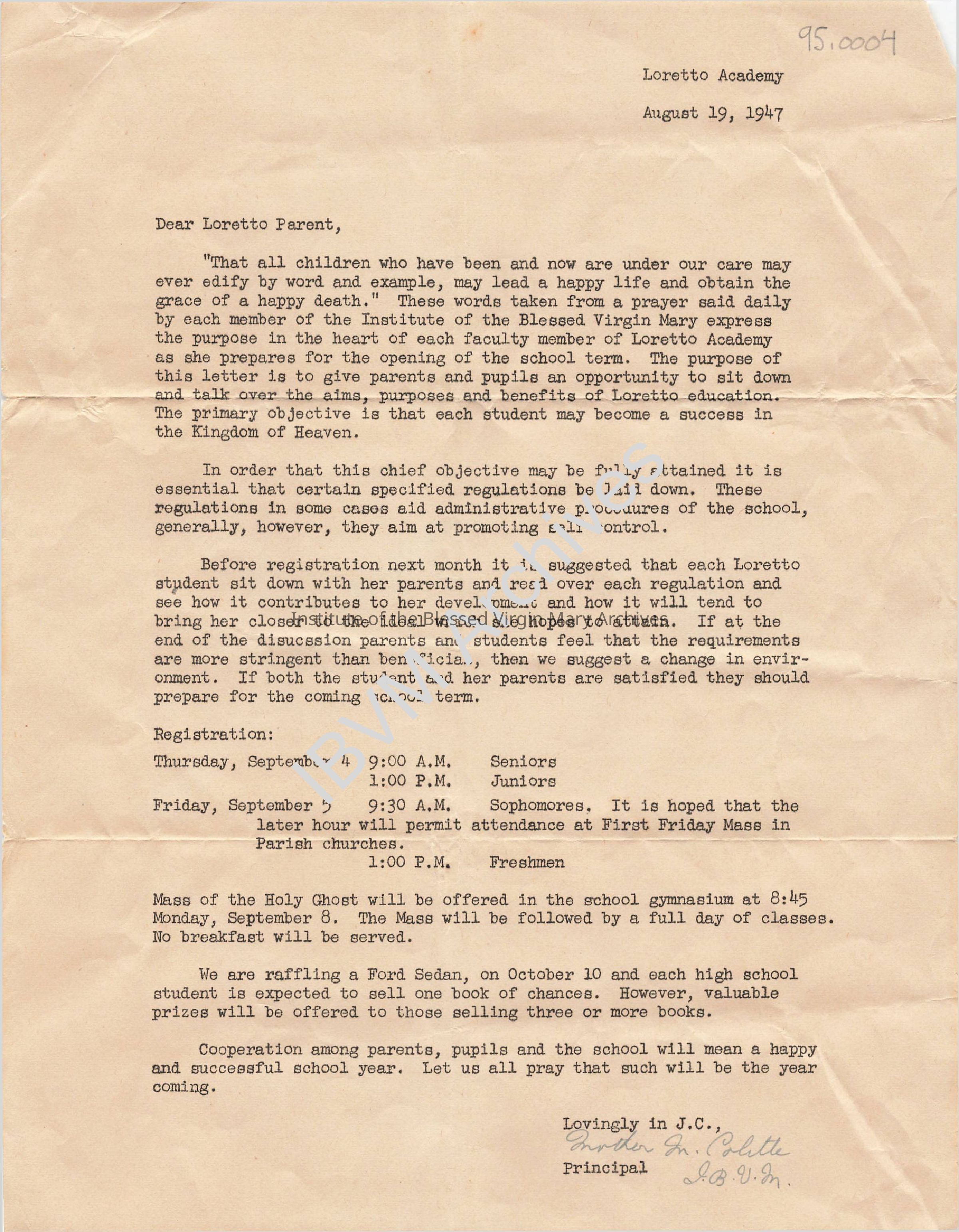 Letter sent from Loretto Academy Woodlawn to parents and students. It discusses the upcoming school year, registration, important dates, regulations and more.