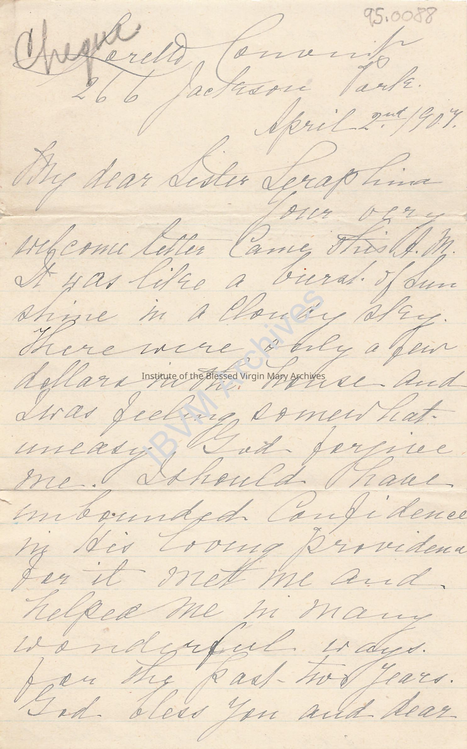 Handwritten letter from Woodlawn Superior Mother Sarah (Seraphina) Dwyer to Sister Marie (Seraphina) Petry. It discusses a financial contribution from Ambrose Petry, brother of Seraphina, as well as a recent visit by him. Other topics include a new altar, weather, an upcoming Chicago election and more.
