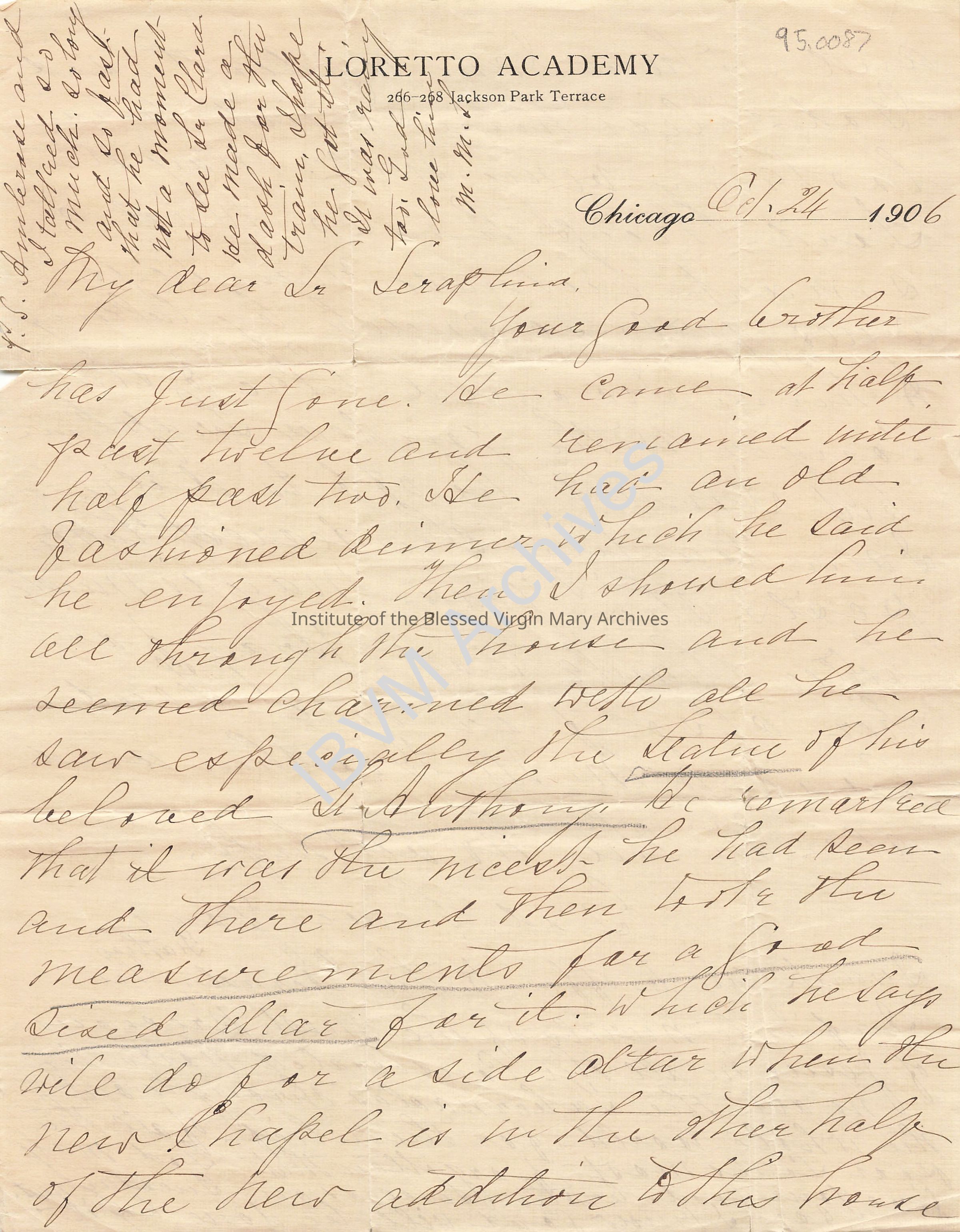 Handwritten letter from Woodlawn Superior Mother Sarah (Seraphina) Dwyer to Sister Marie (Seraphina) Petry. It discusses a visit to Loretto Academy Woodlawn from Ambrose Petry, brother of Seraphina.