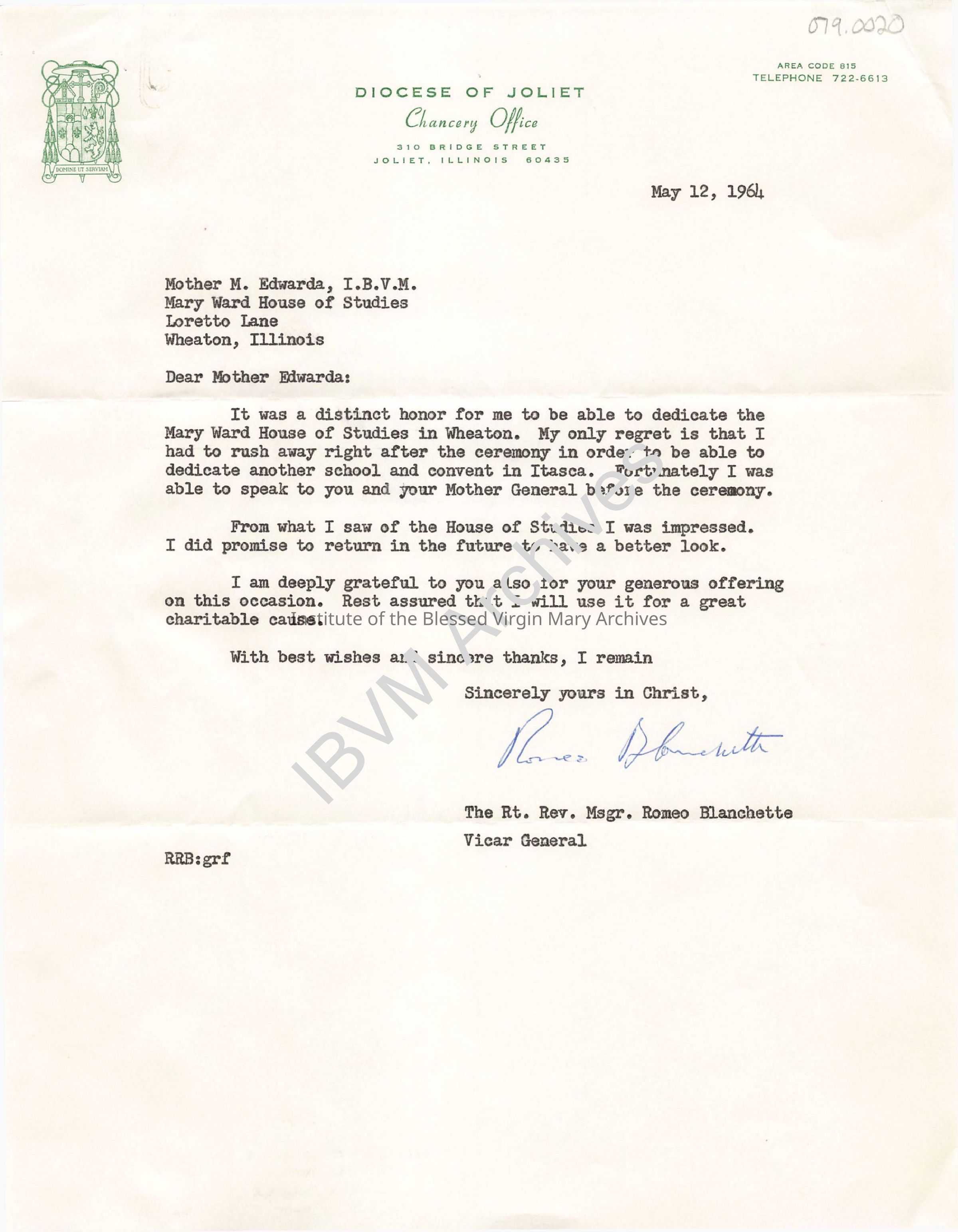 Letter from Reverend Monsignor Romeo Blanchette to Sister Marjorie (Edwarda) Allen. It discusses the recent dedication ceremony for the Mary Ward House of Studies. Completed in 1964, the building was located adjacent to the Loretto Convent and Chapel in Wheaton.