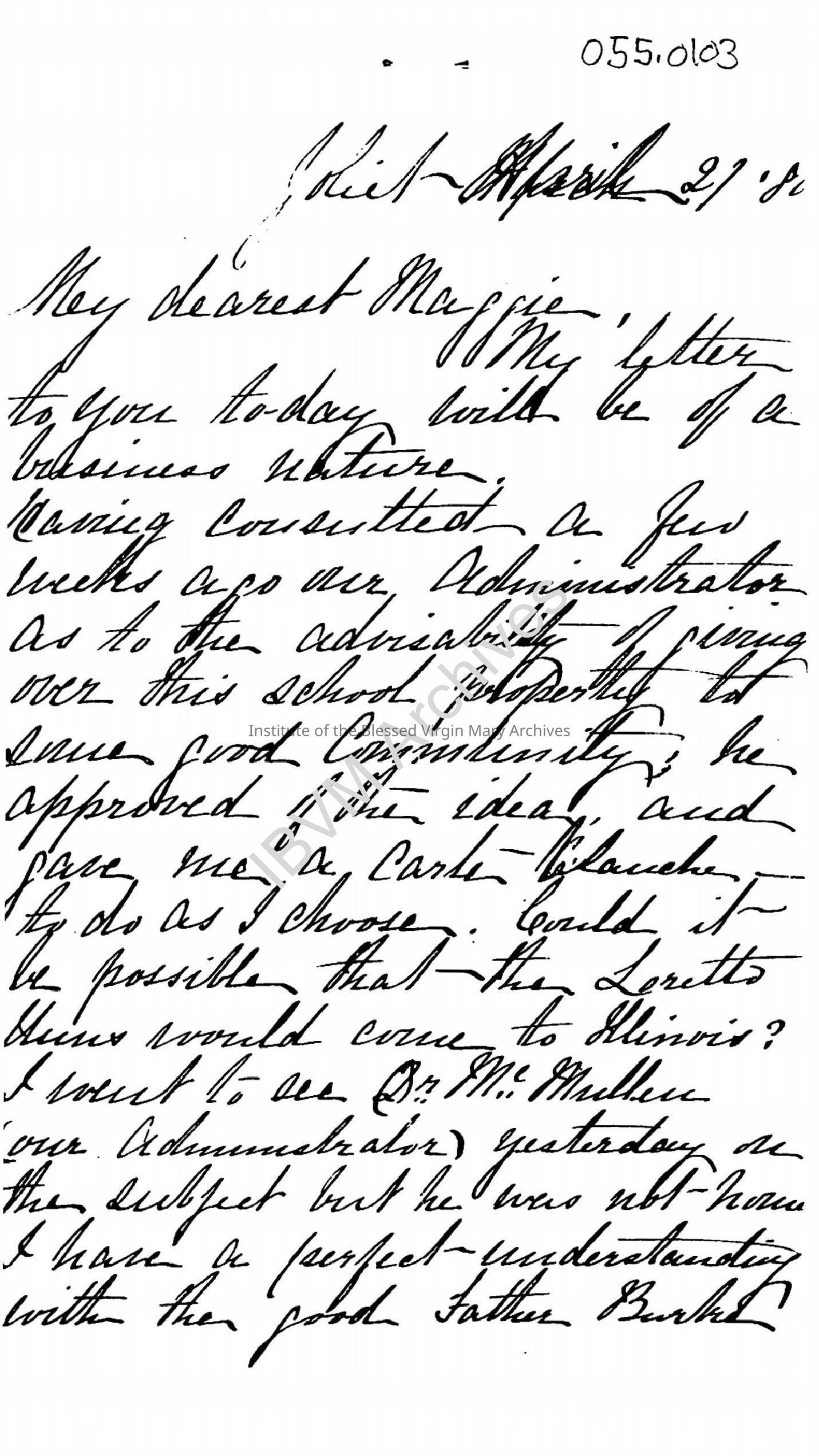 Handwritten letter from Reverend Walter H. Power, Pastor of St. Patrick's Church in Joliet. It discusses the possibility of the Loretto Sisters, then in Canada, establishing a mission in Joliet. The letter also mentions the local population, transportation, Mother Teresa Dease, the Sisters of South Bend, Indiana and other topics.