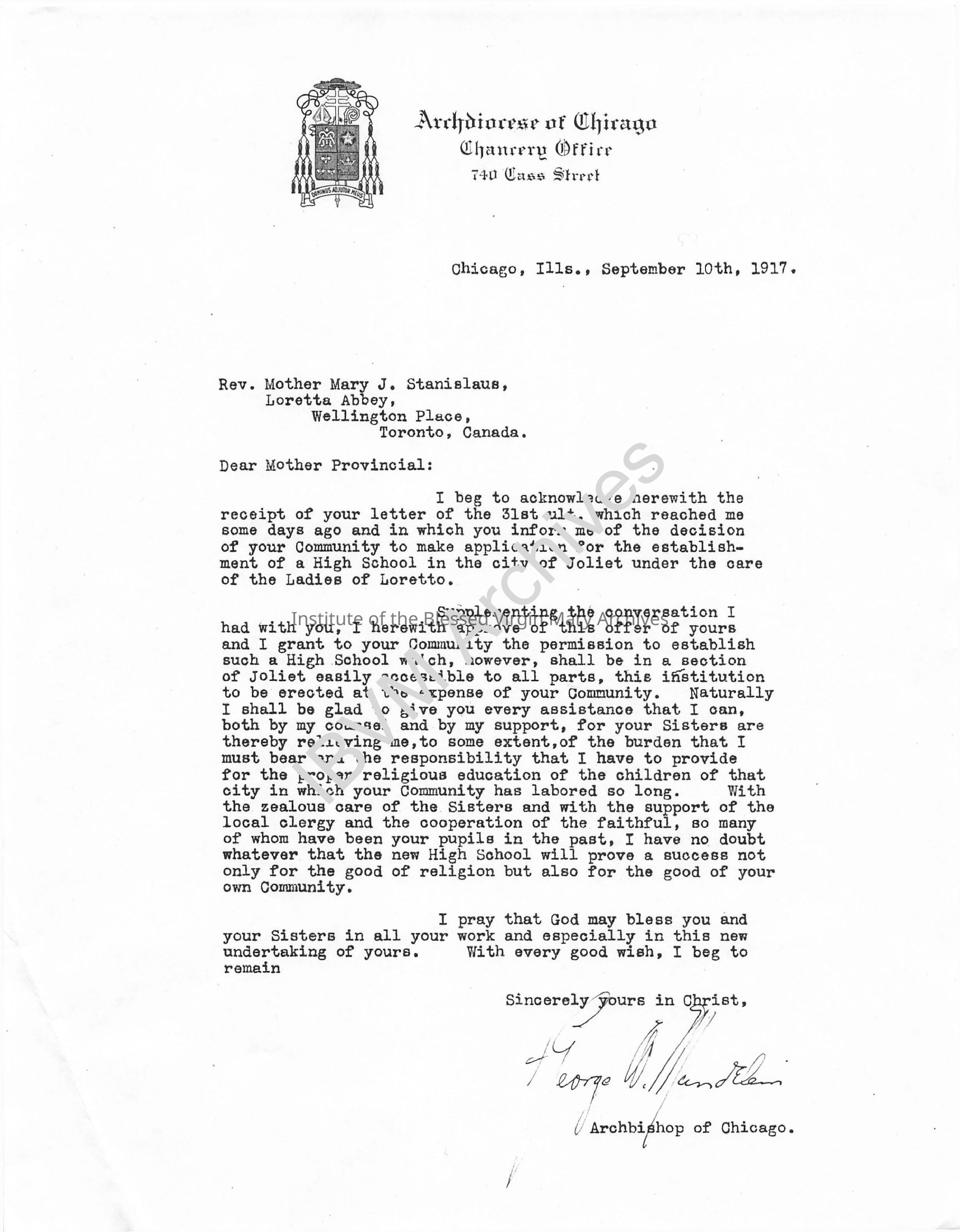 Letter from the Archdiocese of Chicago to the Reverend Mother Mary J. Stanislaus of Toronto, Canada. It grants the IBVM approval to open a new high school in Joliet. Less than one year later, the sisters requested that the archdiocese release them from this commitment. The letter is signed by Archbishop George W. Mundelein.