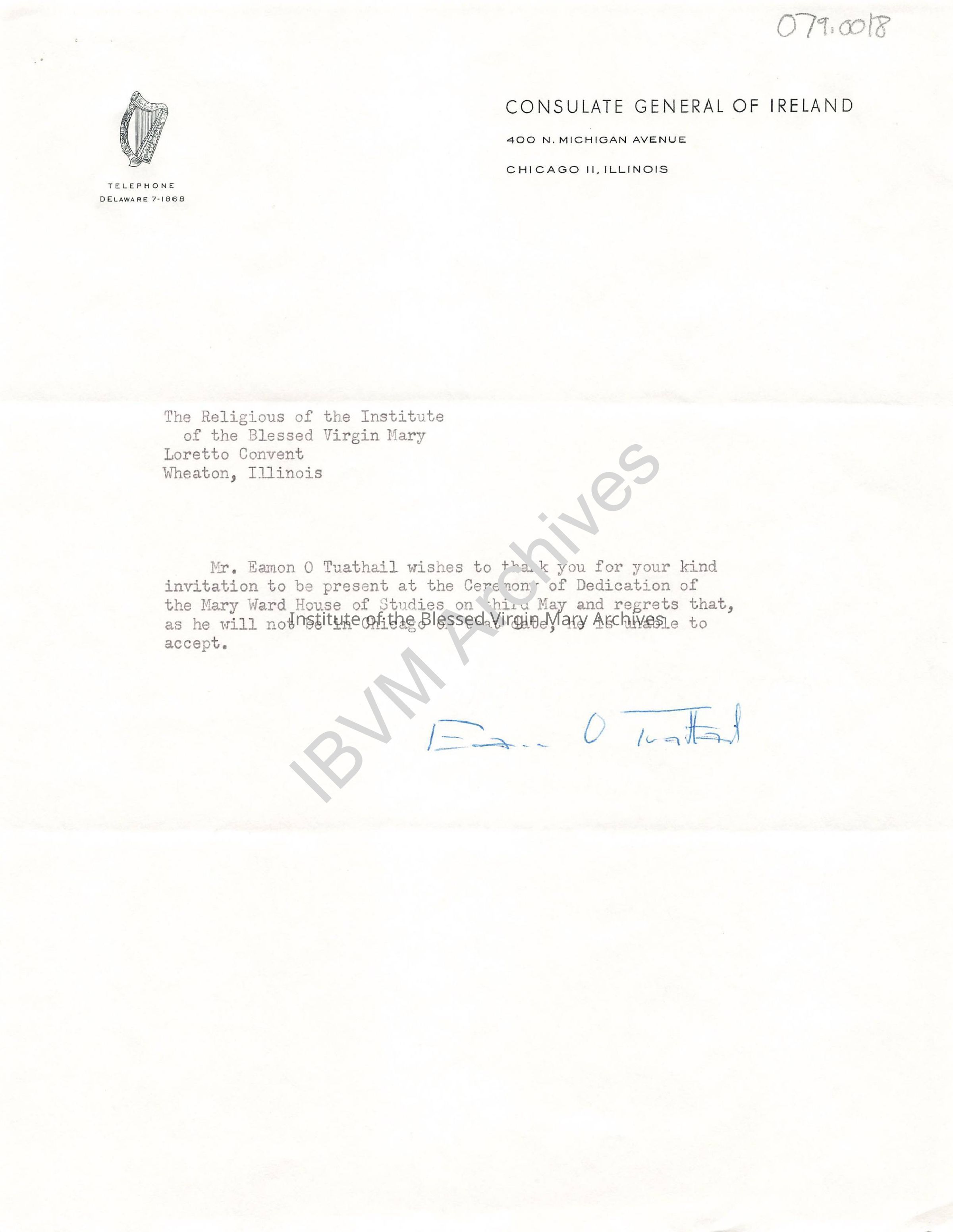 Letter from the Consulate General of Ireland. It discusses the upcoming dedication ceremony for the Mary Ward House of Studies. Completed in 1964, the building was located adjacent to the Loretto Convent and Chapel in Wheaton.