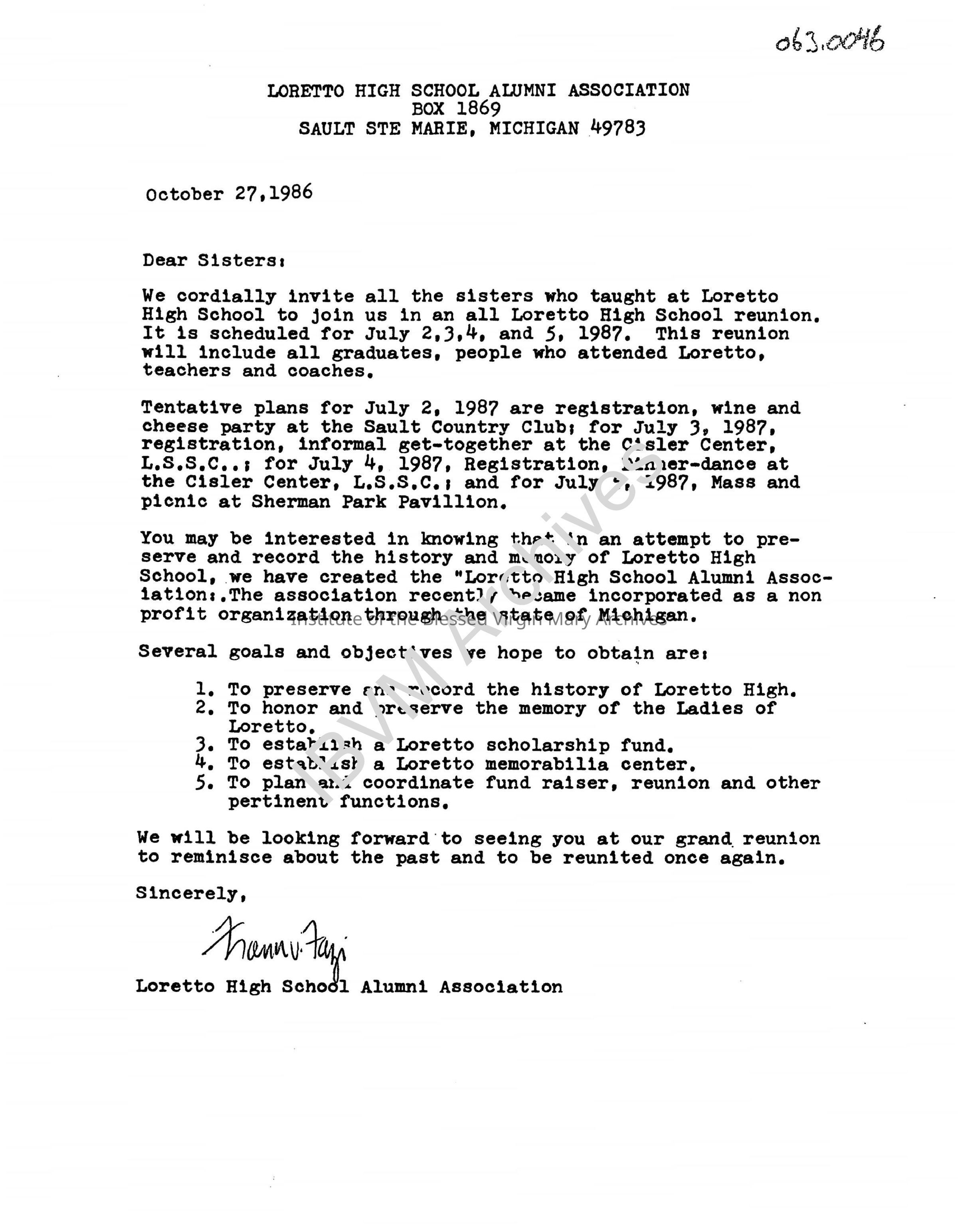 Letter from the Loretto High School Alumni Association in Sault Ste. Marie. It invites all IBVM Sisters who taught at Loretto High School to an upcoming reunion. The event was planned for the following year and included graduates, teachers and coaches.