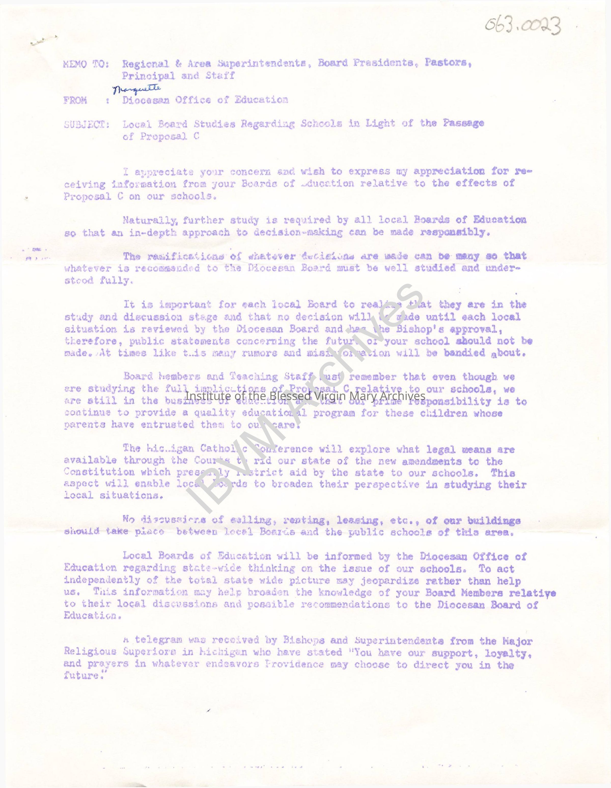 Letter sent by the Marquette Diocesan Office of Education to superintendents, board presidents, pastors, principals and staff in the area of Sault Ste. Marie. It discusses the potential effects of Proposal C on Catholic schools in Michigan, steps being taking and guidelines for how to proceed. The proposal was an amendment to the state constitution which restricted public funding to non public institutions. Ultimately, this led to the closing of several Catholic schools in Sault Ste. Marie and the creation of a new religious education program.