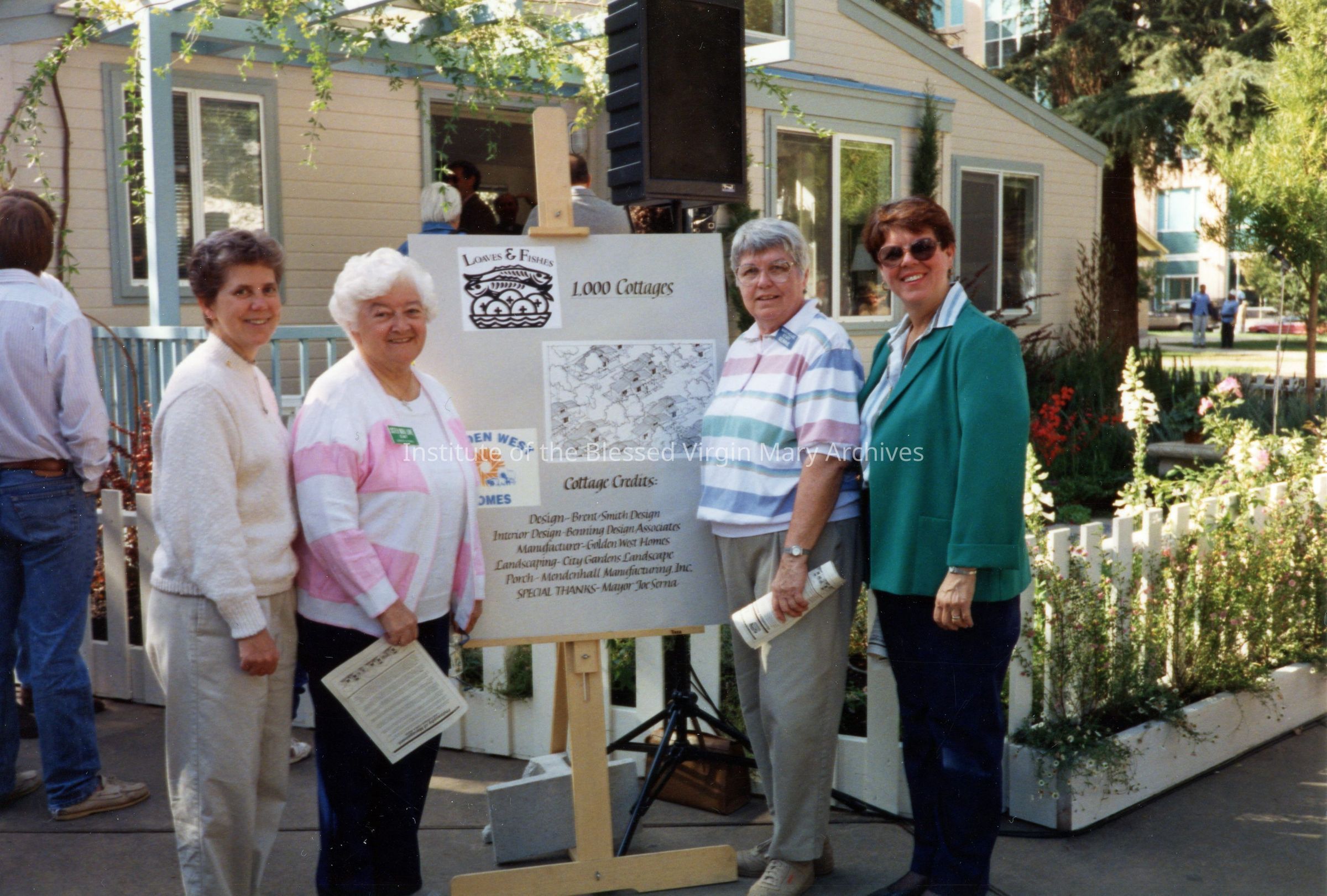 Sister Judy (Mary Brideen) Illig, left, Sister Nora (St. Catharine) Lowe, second from left, and Sister Gail (Jane Patrice) McKirchy, far right, attend a Loaves and Fishes event promoting the construction of affordable homes, later known as Quinn Cottages. In 1986, Sister Nora became Associate Director of Maryhouse, a day shelter for homeless women and children. By 1991, she was named Associate Director of the Jail Visitation Program and served in that capacity until her passing in late 1993.