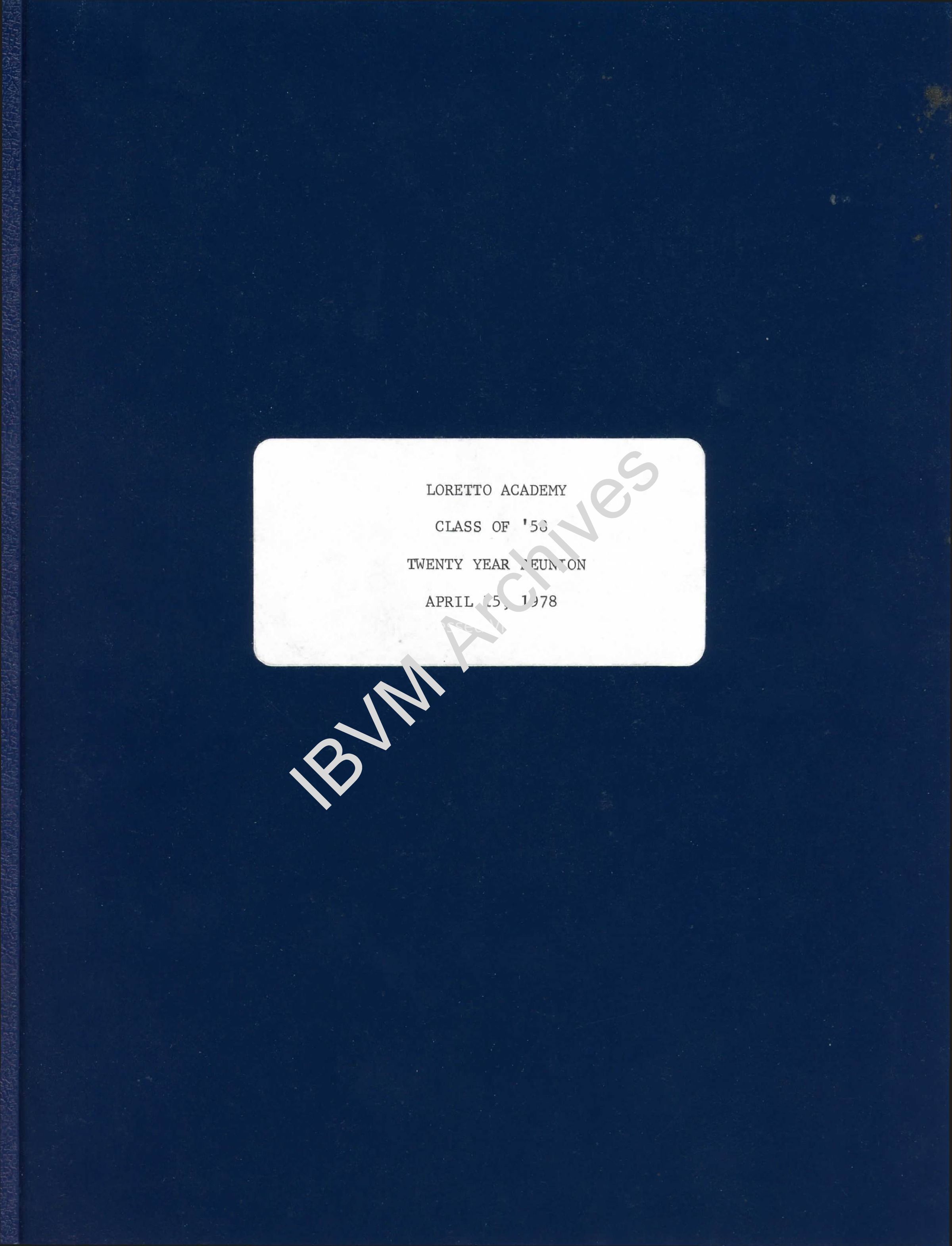 Program for the twentieth year reunion of the Loretto Academy Woodlawn Class of 1958. It includes the school song, class photo and alumnae contact information.