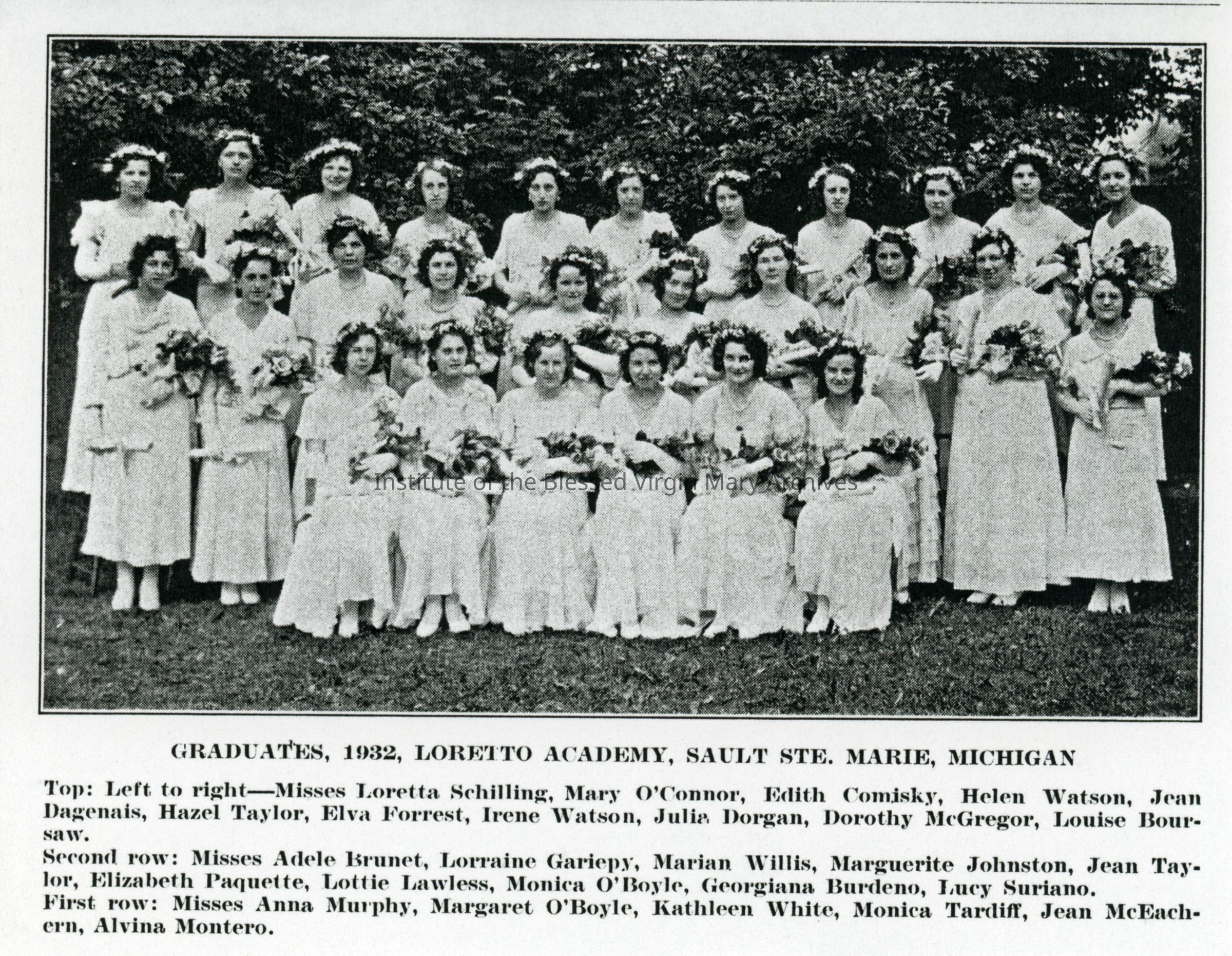 The 1932 graduating class of Loretto Academy, later Loretto High School, in Sault Ste. Marie, Michigan. In the back row, from left to right, are Loretta Schilling, Mary O'Connor, Edith Comisky, Helen Watson, Jean Dagenais, Hazel Taylor, Elva Forrest, Irene Watson, Julia Dorgan, Dorothy McGregor and Louise Boursaw. In the second row, from left to right, are Adele Brunet, Lorraine Gariepy, Marian Willis, Marguerite Johnston, Jean Taylor, Elizabeth Paquette, Lottie Lawless, Monica O'Boyle, Georgiana Burdeno and Lucy Suriano. In the first row, from left to right, are Anna Murphy, Margaret O'Boyle, Kathleen White, Monica Tardiff, Jean McEachern and Alvina Montero.