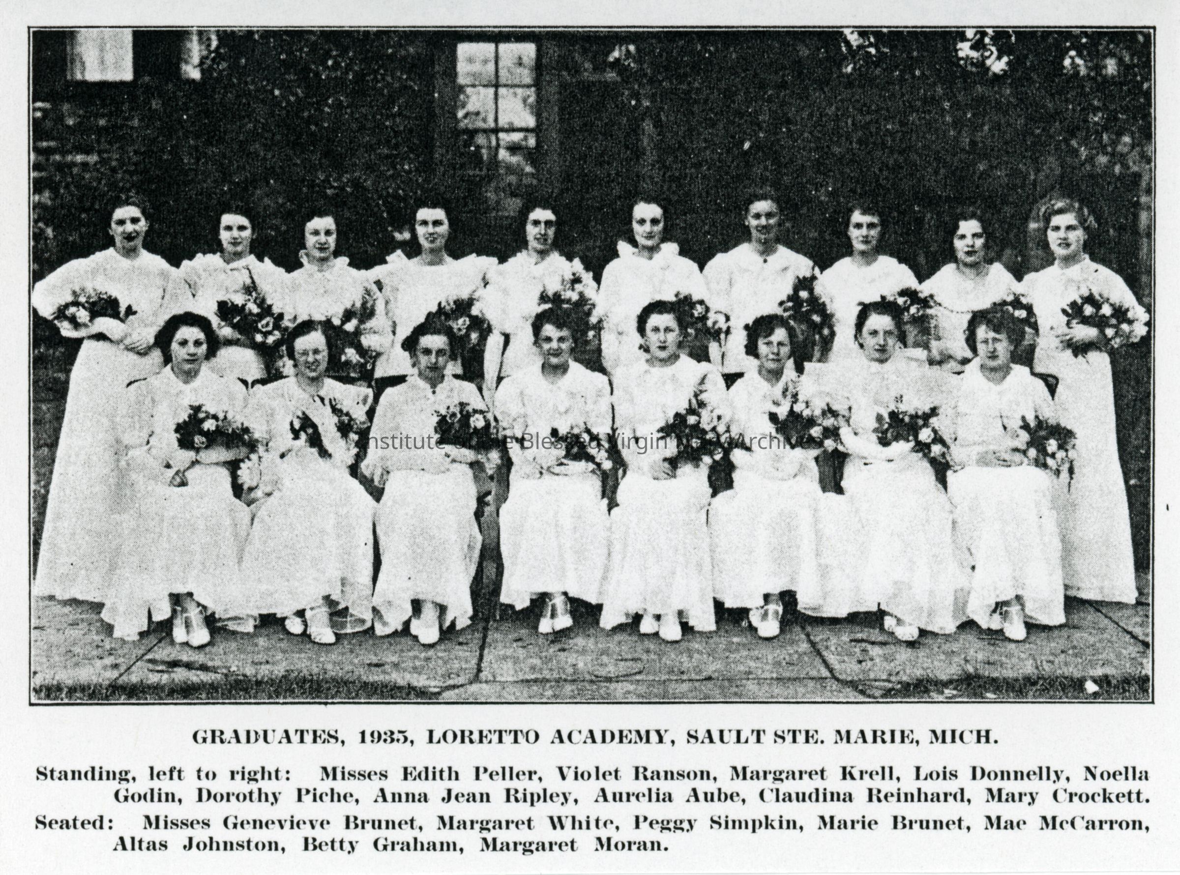 The 1935 graduating class of Loretto Academy, later Loretto High School, in Sault Ste. Marie, Michigan. In the back row, from left to right, are Edith Peller, Violet Ranson, Margaret Krell, Lois Donnelly, Noella Godin, Dorothy Piche, Anna Jean Ripley, Aurelia Aube, Claudina Reinhard and Mary Crockett. In the front row, from left to right, are Genevieve Brunet, Margaret White, Peggy Simpkin, Marie Brunet, Mae McCarron, Atlas Johnston, Betty Graham and Margaret Moran.