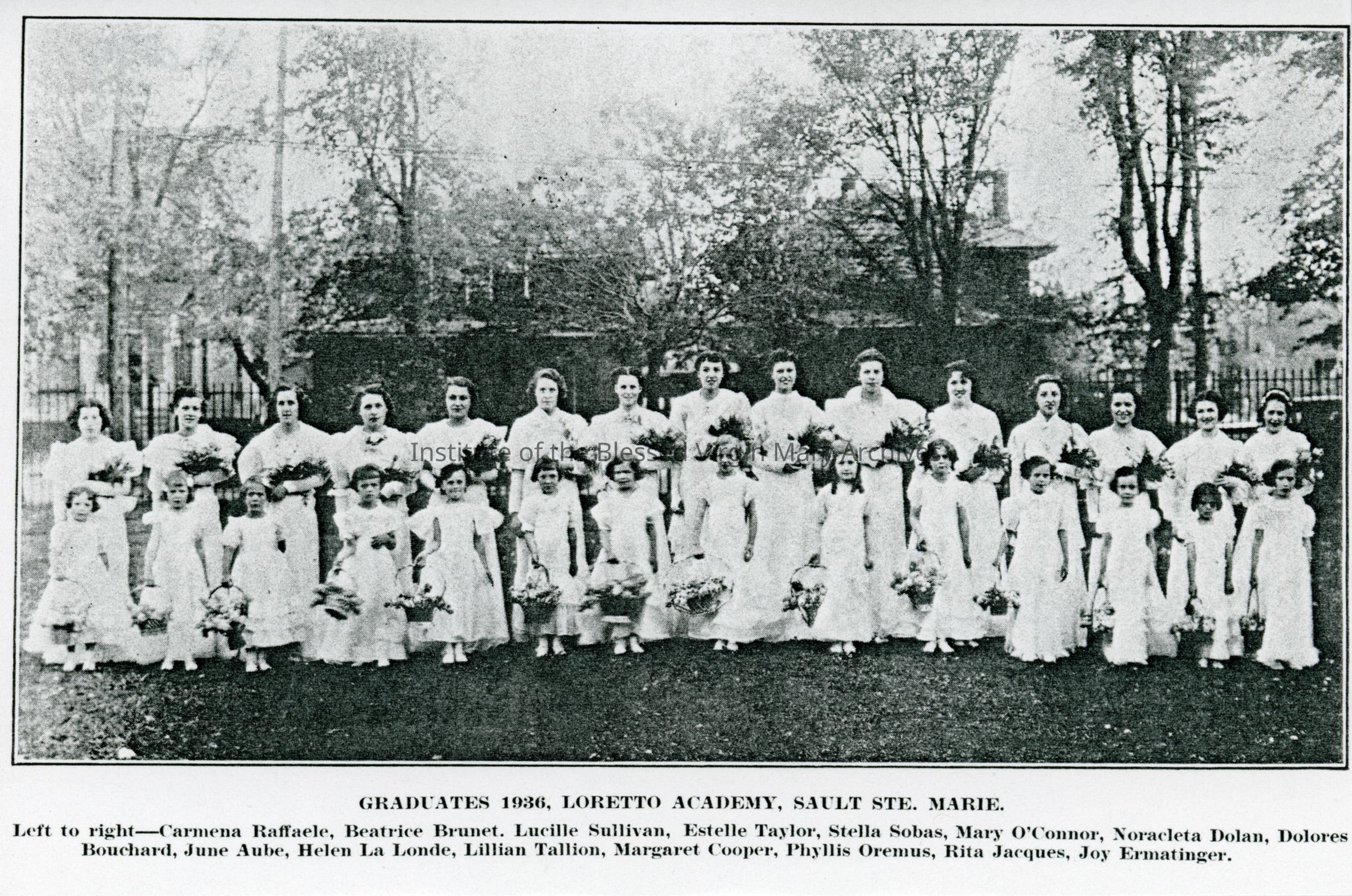 The 1936 graduating class of Loretto Academy, later Loretto High School, in Sault Ste. Marie, Michigan. The children in the front row participated as flower girls. In the back row, from left to right, are Carmena Raffaele, Beatrice Brunet, Lucille Sullivan, Estelle Taylor, Stella Sobas, Mary O'Connor, Noracleta Dolan, Dolores Bouchard, June Aube, Helen La Londe, Lillian Tallion, Margaret Cooper, Phyllis Oremus, Rita Jacques and Joy Ermatinger.