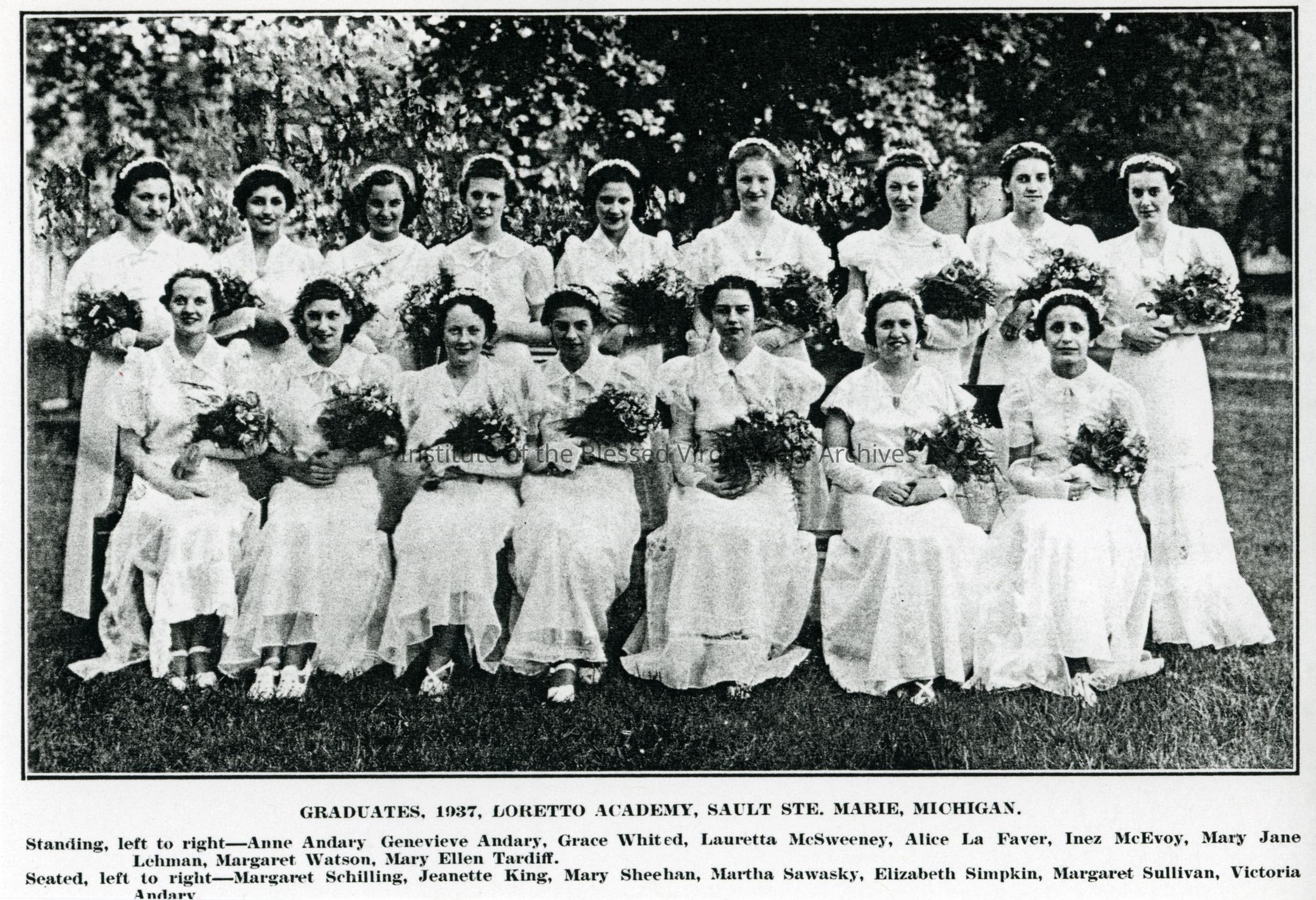 The 1937 graduating class of Loretto Academy, later Loretto High School, in Sault Ste. Marie, Michigan. In the back row, from left to right, are Anne Andary, Genevieve Andary, Grace Whited, Lauretta McSweeney, Alice La Faver, Inez McEvoy, Mary Jane Lehman, Margaret Watson and Mary Ellen Tardiff. In the front row, from left to right, are Margaret Schilling, Jeanette King, Mary Sheehan, Martha Sawasky, Elizabeth Simpkin, Margaret Sullivan and Victoria Andary.
