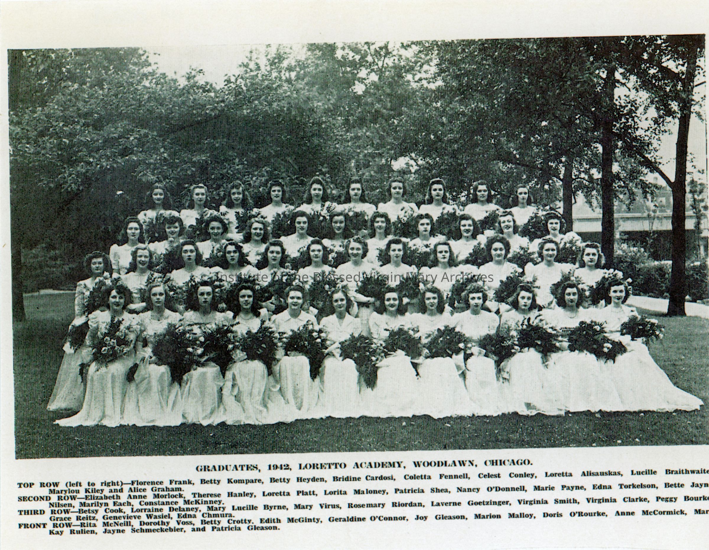 The 1942 graduating class of Loretto Academy Woodlawn. Top row, from left to right, are Florence Frank, Betty Kompare, Betty Heyden, Bridine Cardosi, Coletta Fennell, Celest Conley, Loretta Alisaukas, Lucille Braithwaite, Marylou Kiley and Alice Graham. Second row, from left to right, are Elizabeth Anne Morlock, Therese Hanley, Loretta Platt, Lorita Maloney, Patricia Shea, Nancy O'Donnell, Marie Payne, Edna Torkelson, Betty Jayne Nilsen, Marilyn Each and Constance McKinney. Third row, from left to right, are Betsy Cook, Lorraine Delaney, Mary Lucille Byrne, Mary Virus, Rosemary Riordan, Laverne Goetzinger, Virginia Smith, Virginia Clarke, Peggy Bourke, Grace Reity, Genevieve Wasiel and Edna Chmura. Fourth row, from left to right, includes Rita McNeill, Dorothy Voss, Betty Crotty, Edith McGinty, Geraldine O'Connor, Joy Gleason, Marion Malloy, Doris O'Rourke, Anne McCormick, Mary Kay Rulien, Jayne Schmeckebier and Patricia Gleason.