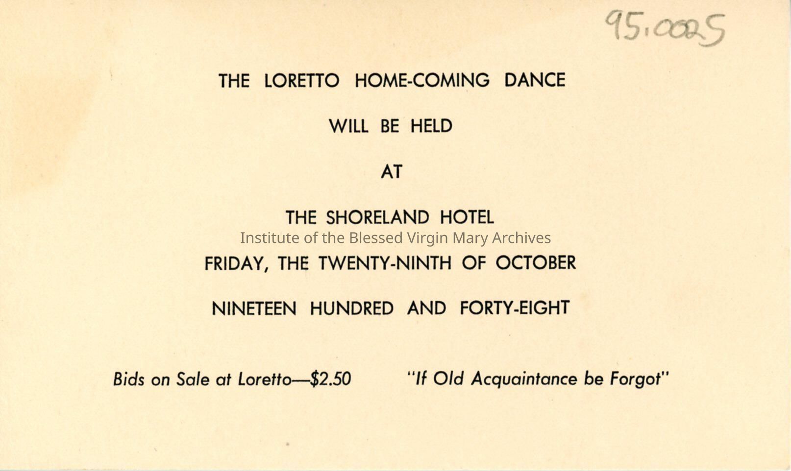 Invitation to the Loretto Academy Woodlawn Homecoming Dance. The event was held at the Shoreland Hotel at 5454 South Shore Drive in Chicago.