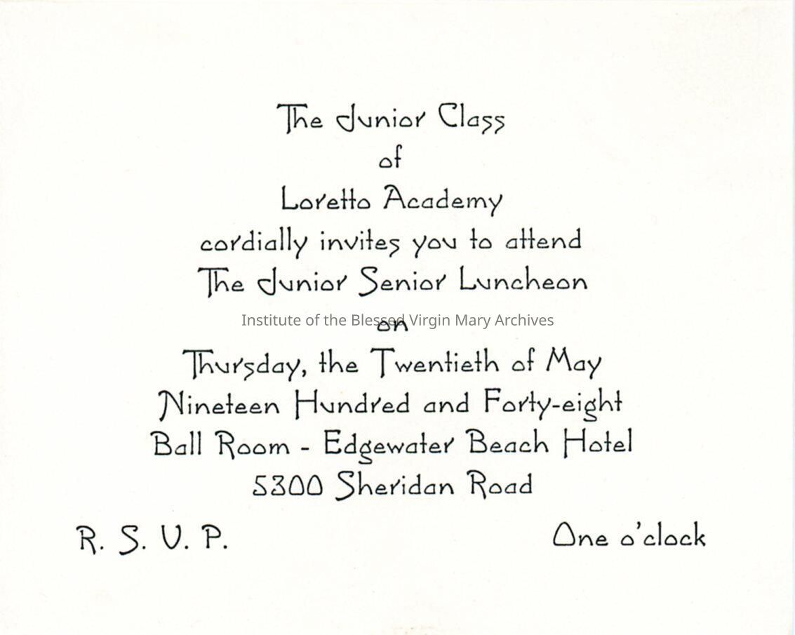 Loretto Academy Junior Senior Luncheon Invitation, 1948Entry/Object ID