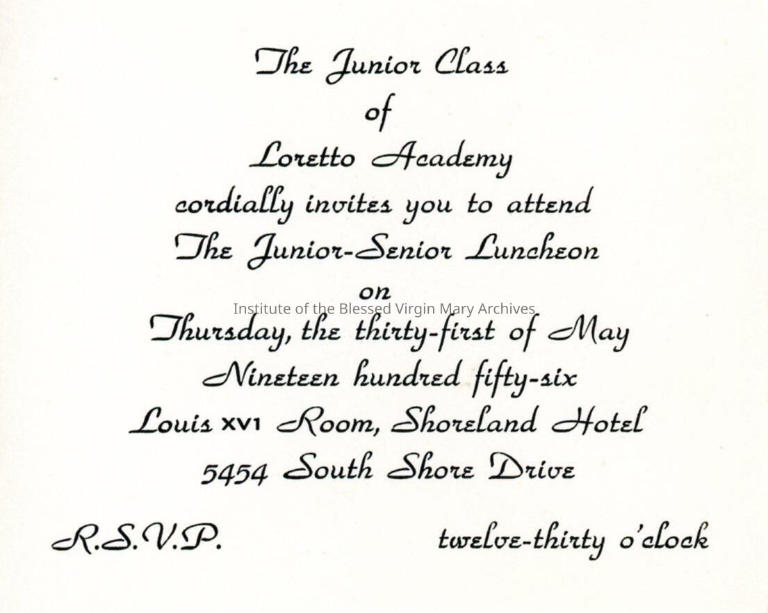 Invitation to the Loretto Academy Woodlawn Junior Senior Luncheon. The event was held at the Shoreland Hotel at 5454 South Shore Drive in Chicago.