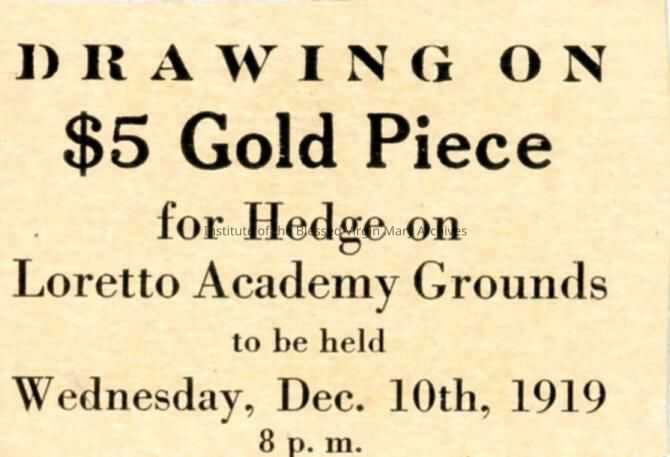 Loretto Academy Woodlawn raffle ticket for a drawing on a five dollar gold piece. The event was held at the Community Club Rooms located at 6357 South Dante Avenue.