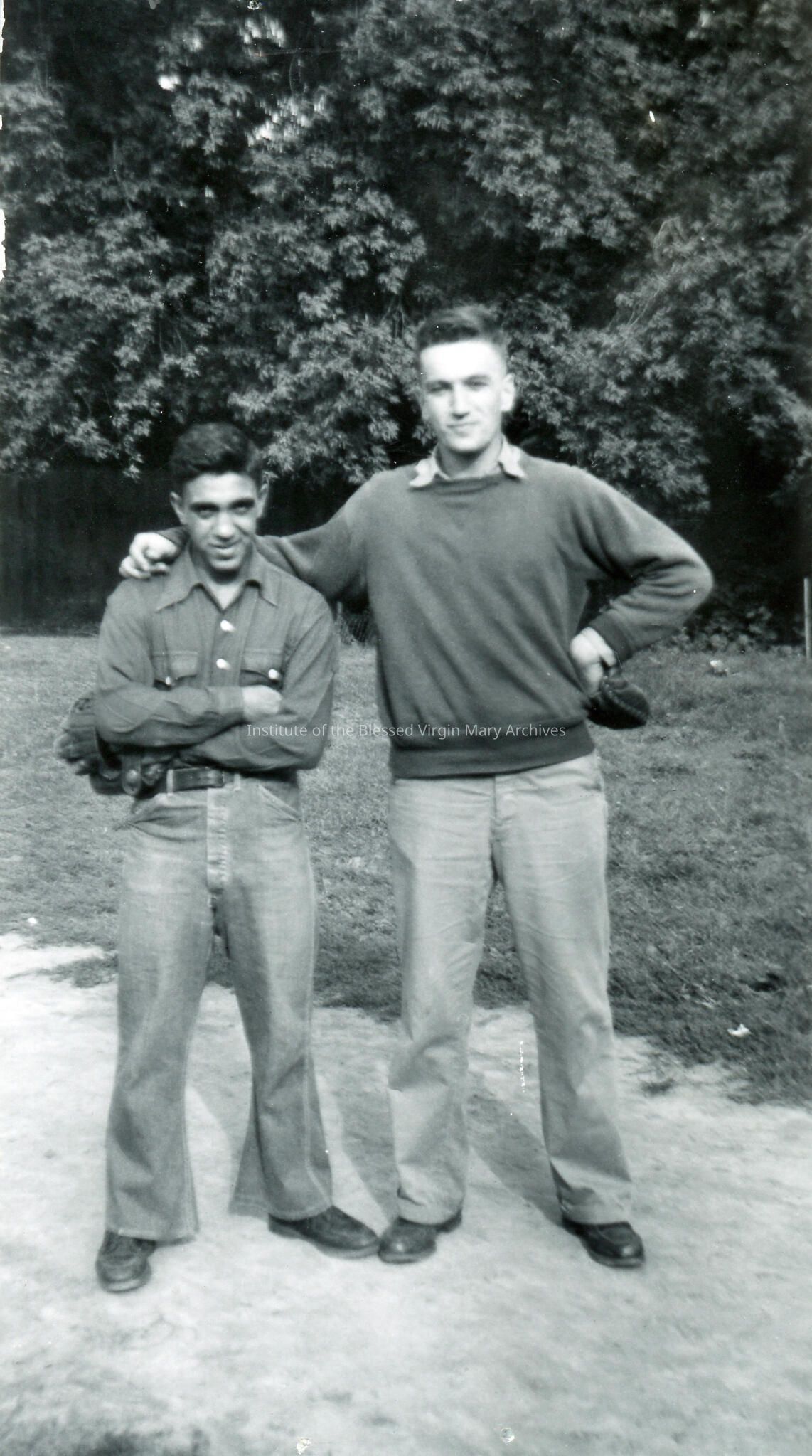 Students, identified as Jim and Tony, at Loretto Academy/Loretto High School in Sault Ste. Marie, Michigan. Founded in 1896, the academy's location at 377 Armory Place (pictured) opened in 1899 and underwent a substantial addition in 1910. Converted into a co-ed high school in 1944, it was demolished in 1966 after Loretto Catholic Central High School was constructed.