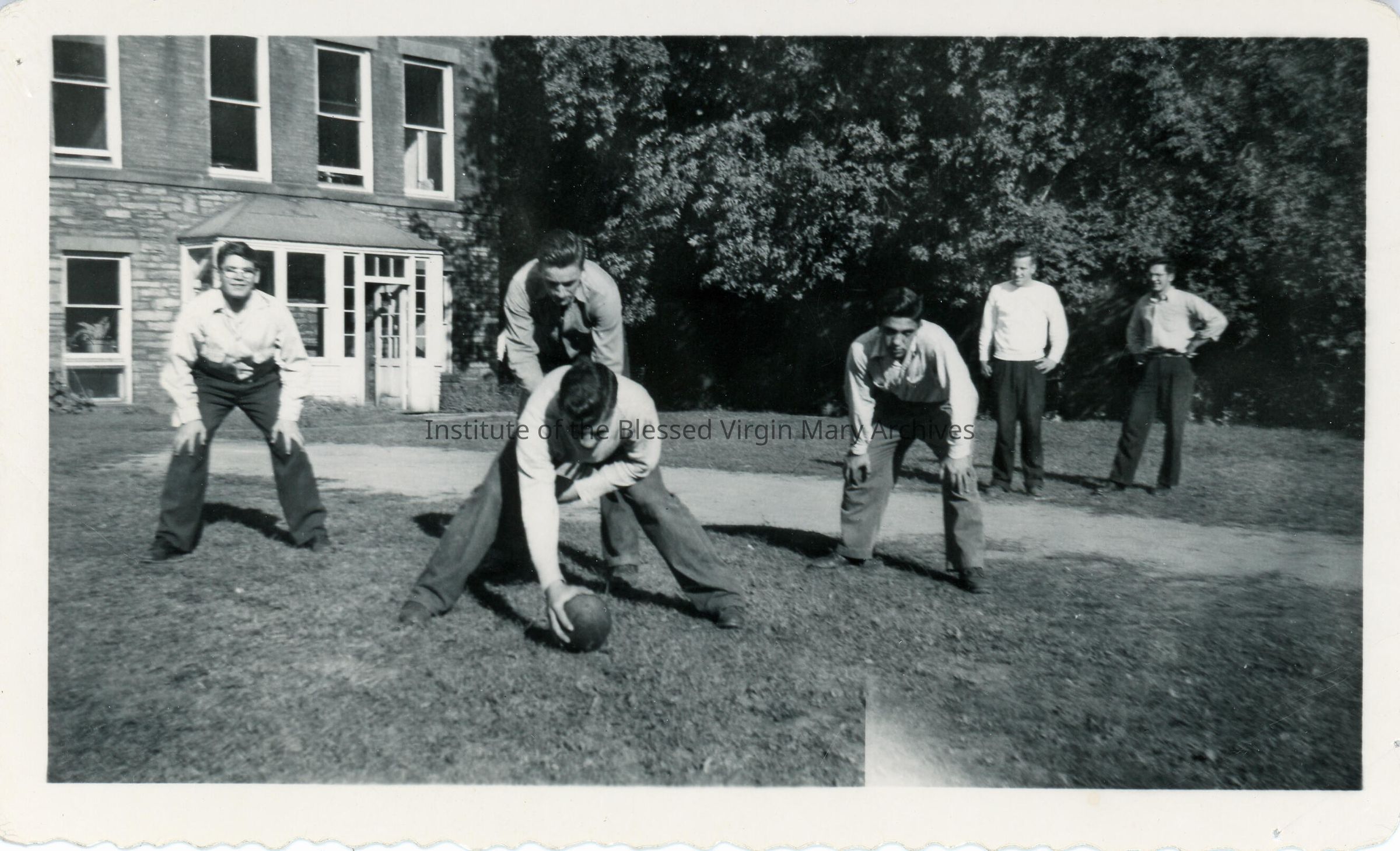Students playing football at Loretto Academy/Loretto High School in Sault Ste. Marie, Michigan. Founded in 1896, the academy's location at 377 Armory Place (pictured) opened in 1899 and underwent a substantial addition in 1910. Converted into a co-ed high school in 1944, it was demolished in 1966 after Loretto Catholic Central High School was constructed.