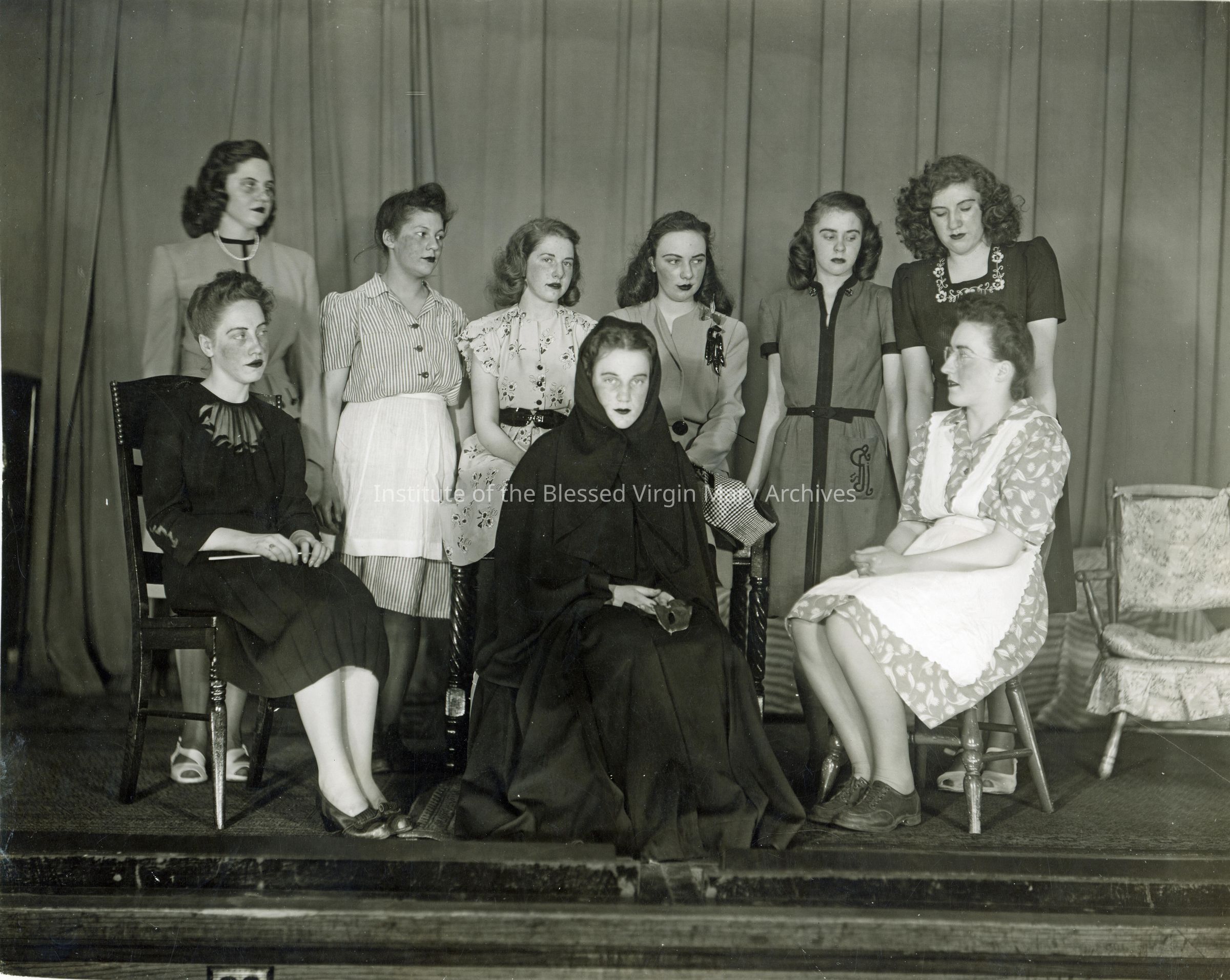 Loretto Academy/Loretto High School in Sault Ste. Marie, Michigan. This image features students in the senior play. Seated, from left to right, are Constance Belleau, Virginia Stevenson and Rita Myotte. Standing, from left to right, are Dorothy Zutchik, Mary Massey, Lorraine Colasanti, Mary Giacoletto, Barbara Mansfield and Blanche Riggs. Founded in 1896, the academy's location at 377 Armory Place (pictured) opened in 1899 and underwent a substantial addition in 1910. Converted into a co-ed high school in 1944, it was demolished in 1966 after Loretto Catholic Central High School was constructed.