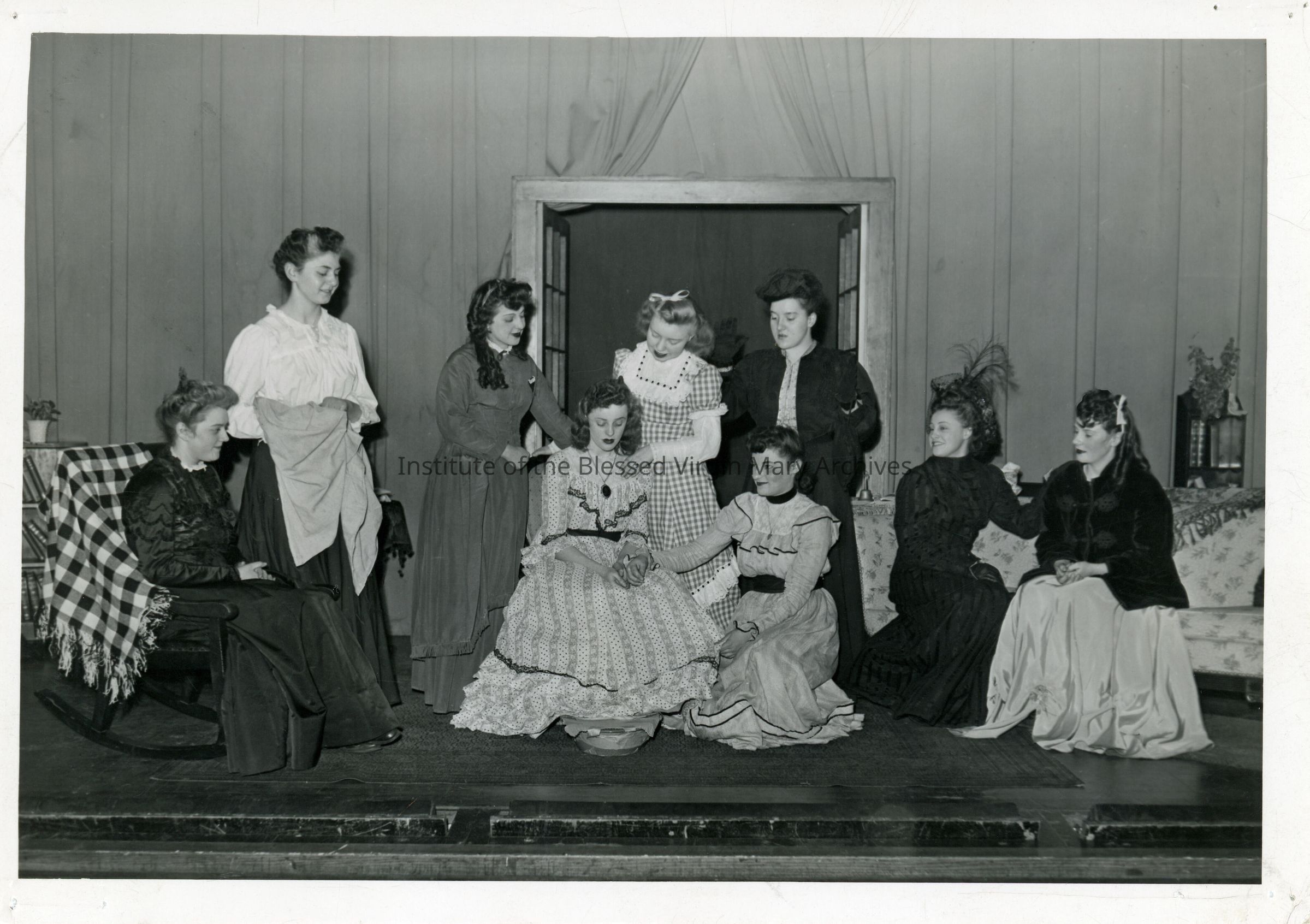 Students presenting "Little Women" at Loretto Academy/Loretto High School in Sault Ste. Marie, Michigan. Founded in 1896, the academy's location at 377 Armory Place (pictured) opened in 1899 and underwent a substantial addition in 1910. Converted into a co-ed high school in 1944, it was demolished in 1966 after Loretto Catholic Central High School was constructed.