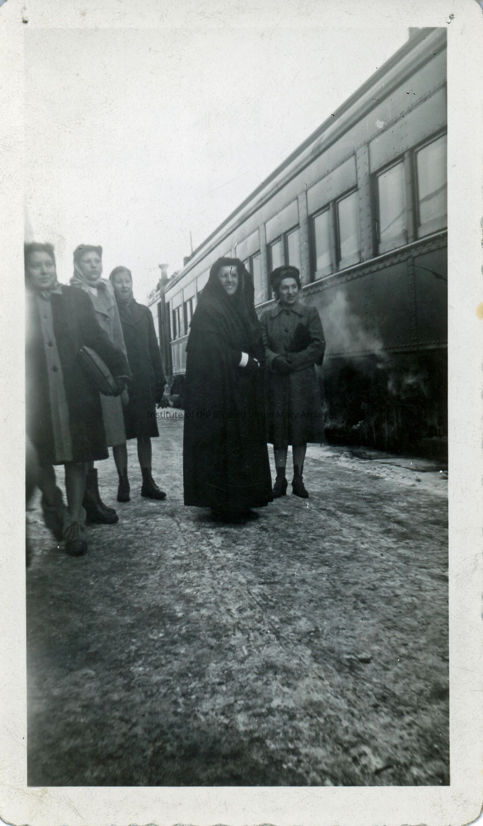 Standing near a train car, an unidentified Sister and students from Loretto Academy/Loretto High School wait at the station in Sault Ste. Marie, Michigan. Founded in 1896, the academy's location at 377 Armory Place opened in 1899 and underwent a substantial addition in 1910. Converted into a co-ed high school in 1944, it was demolished in 1966 after Loretto Catholic Central High School was constructed.