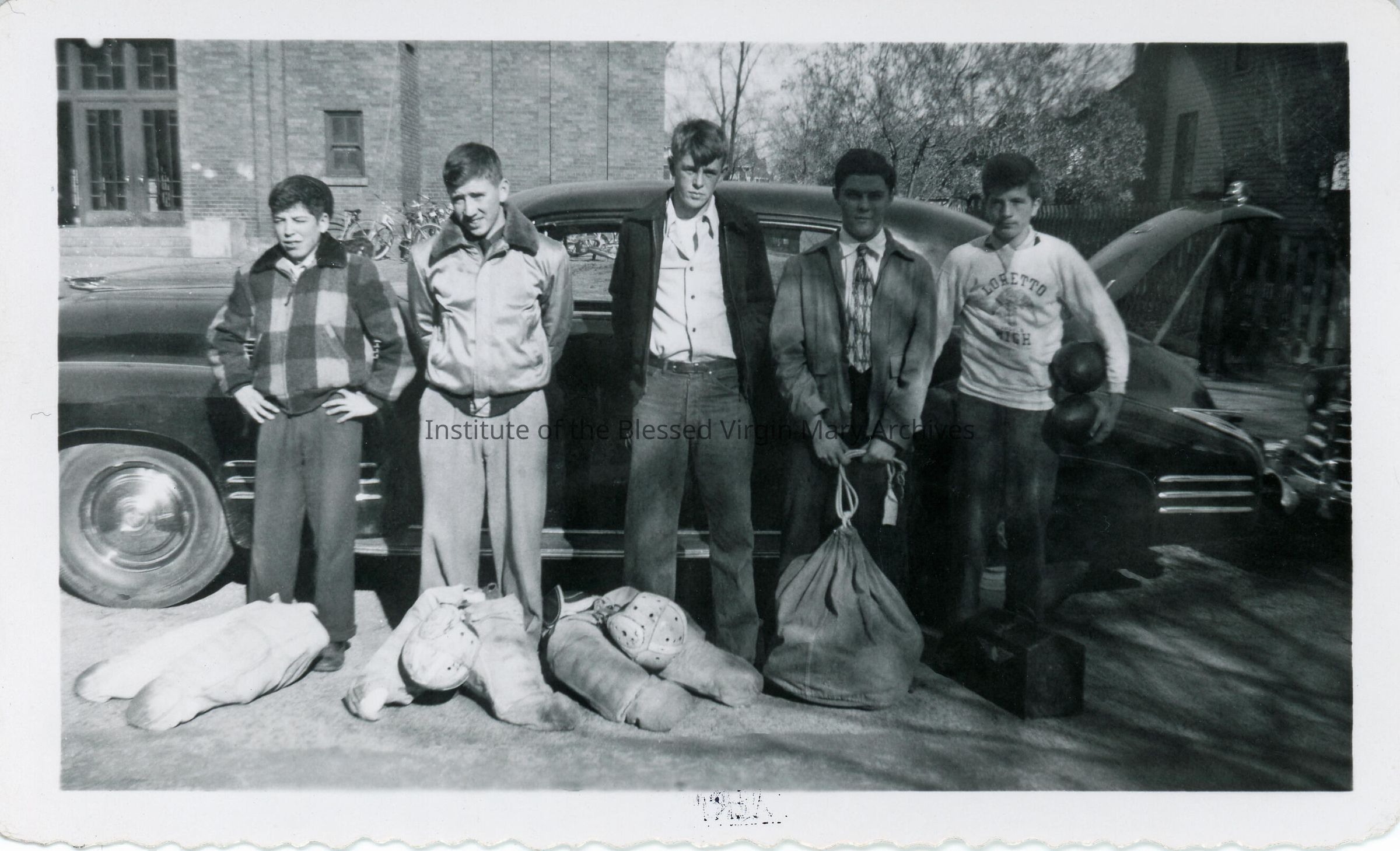 Student football players at Loretto Academy/Loretto High School in Sault Ste. Marie, Michigan. St. Mary's School, at 360 Maple Street, is in the background. Founded in 1896, the academy's location at 377 Armory Place (pictured) opened in 1899 and underwent a substantial addition in 1910. Converted into a co-ed high school in 1944, it was demolished in 1966 after Loretto Catholic Central High School was constructed.